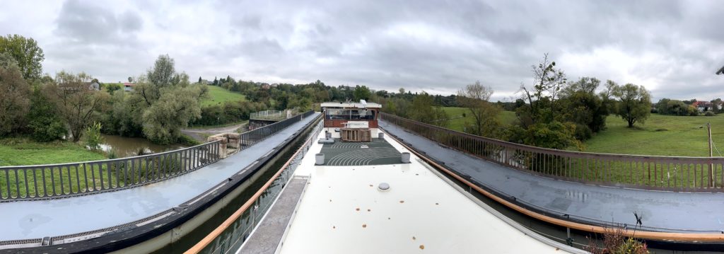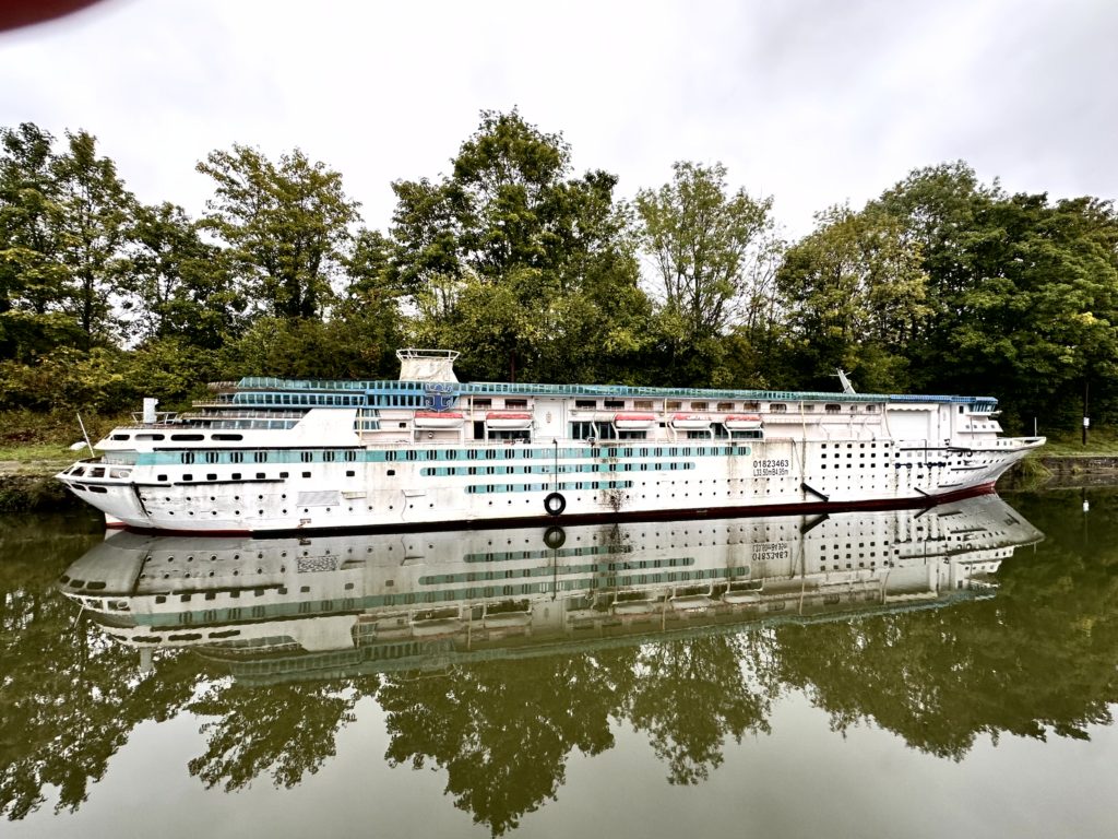 Heute Morgen um 8.00 Uhr ging es weiter. Knapp 25 km und 8 Schleusen lagen auf dem Weg nach Sarralbe. Zwar alles grau in grau, aber es regnete nicht mehr. Wir fuhren ganz nah an der Majesty of the Sea vorbei. Wahnsinn, diese Arbeit, alles im Eigenbau und nun vergammelt es im Hafen von Sarreguimines.
