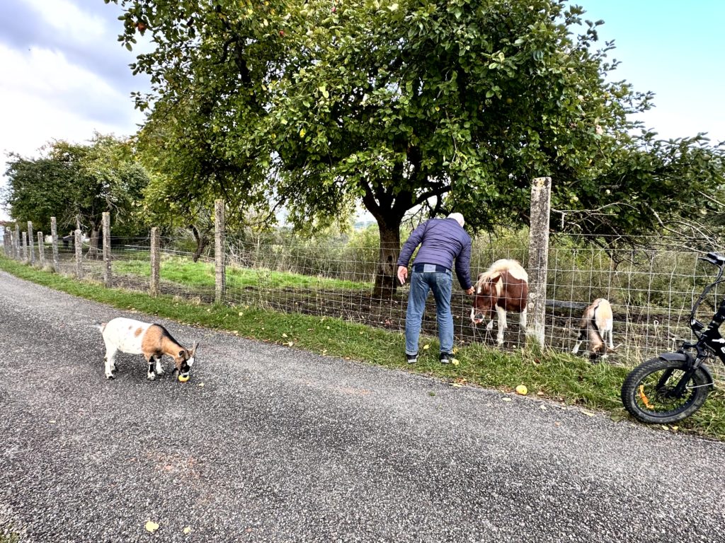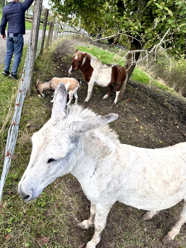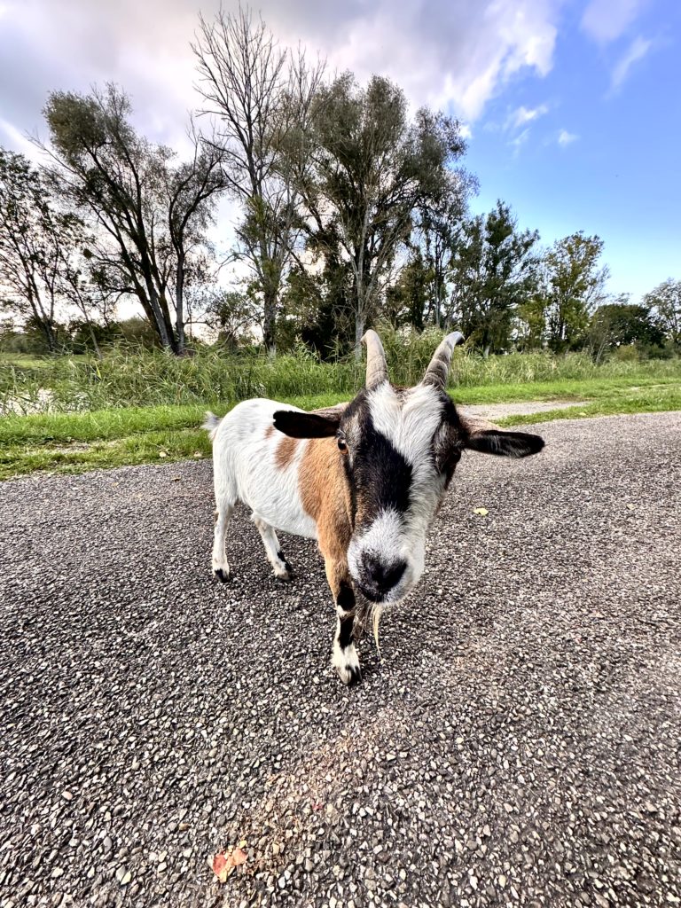 Kurz vorm Ziel machten wir noch Halt bei einem Pony, zwei Ziegen und einem Esel. Ein paar Streicheleinheiten mussten schon sein. Irgendwie ist einer der kleinen Böcke aus dem Zaun geschlüpft und hat sich die Äpfel, die draußen lagen, schmecken lassen. Er wird schon irgendwie wieder zurück finden.