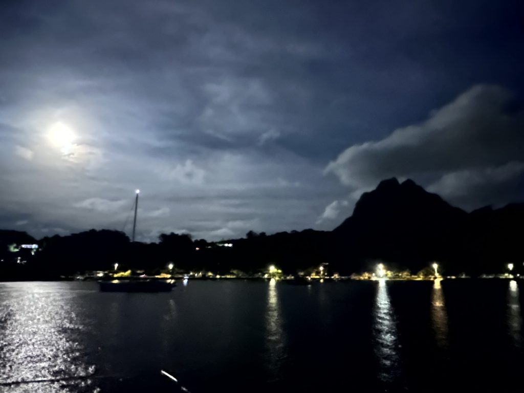Das eingespielte Team machte souverän an der Mooring vor dem Yachtclub fest. Eine tolle Kulisse unterhalb vom Mount Otemanu. Waltraud bereitete ein Curry mit den Shrimps und es gab noch die Reste vom Vortag.