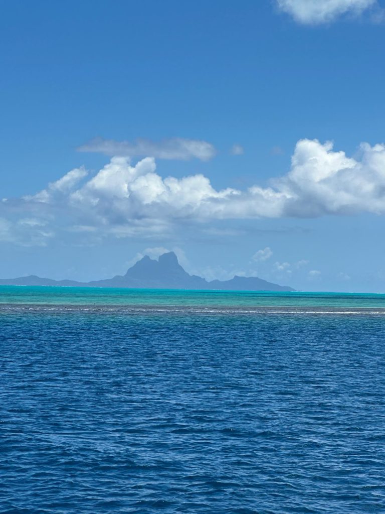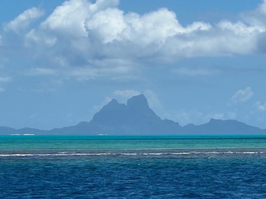 7.00 Uhr früh und alle sitzen schon am Frühstückstisch. Um acht wollte Martin los nach Maupiti. Also Leinen los, durch den Pass und bye bye Bora Bora, dieses Mal ein Abschied nicht nur für die Crew, sondern auch für Martin und mich.