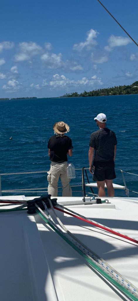 Zurück auf dem Boot reservierte Martin für den polynesischen Folklore Abend heute . Dann ging’s noch einmal um die halbe Insel, bis wir in der Faa‘a Bucht ankamen. Der Bojendienst Hartmut, Leo und Ludwig fischten zum letzten Mal für diesen Törn eine Boje aus dem Wasser und befestigten die Leinen daran.