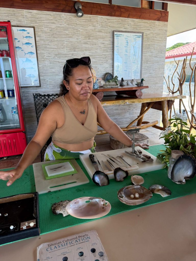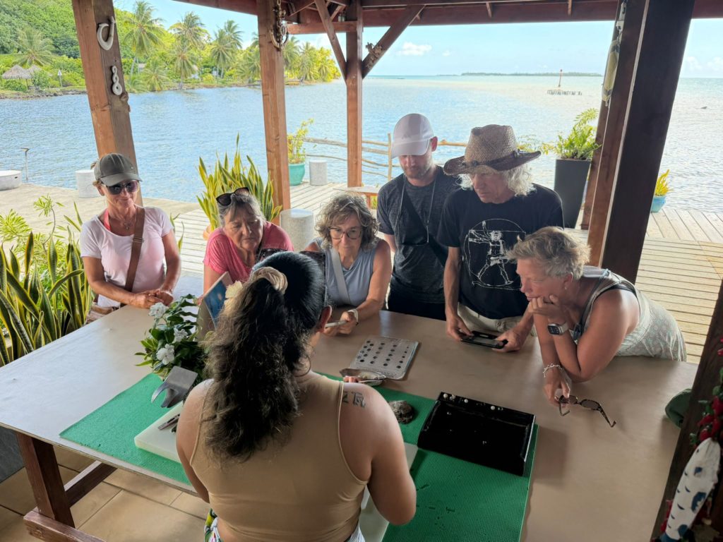 Die Schattenplätze waren , wie bei jedem längeren Schlag, heiß begehrt . Wir erreichten unser Ziel, die Love Here Pearl Farm kurz vor ein Uhr. Ludwig fuhr uns mit dem Dinghi rüber. Wir wurden wie immer sehr nett begrüßt und eine Dame erklärte uns den Entstehungsprozess vom den schwarzen Tahiti Perlen. Die schwarze Farbe der Tahiti Perlen entsteht hauptsächlich durch die Perlmuschelart, in der sie wachsen. Das ist die schwarze Lippen-Perlauster . Auf einer Perlenfarm dauert die Zucht einer Tahitiperle normalerweise etwa 18 Monate bis 3 Jahre. Nach den Erklärungen gingen wir zum Shop. Da haben die Augen geleuchtet. Ist ein tolles Gefühl, in der großen Perlenschatulle zu wühlen. Jeder wurde fündig und nahm etwas mit, wie z. Bsp. lose Perlen , Muschelschalen oder Armbändchen. Zum Schluss bekamen wir jeder noch eine kleine Perle geschenkt.