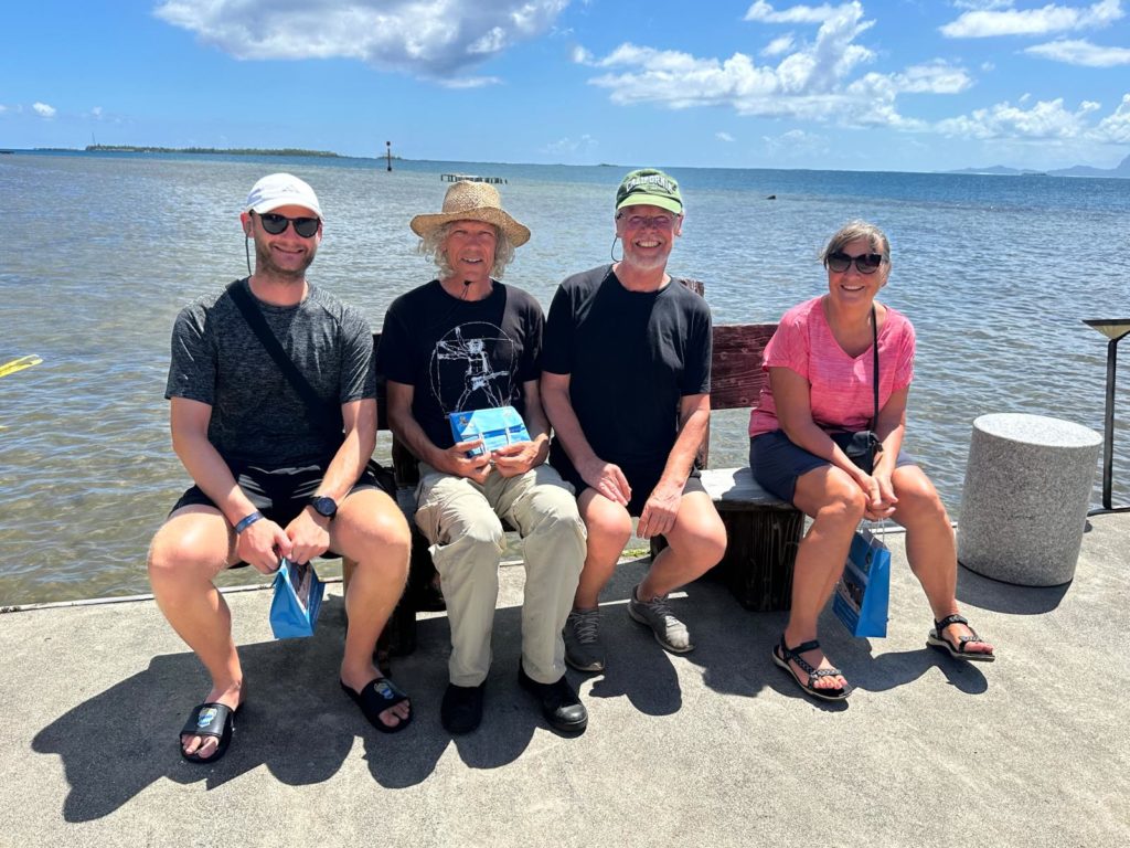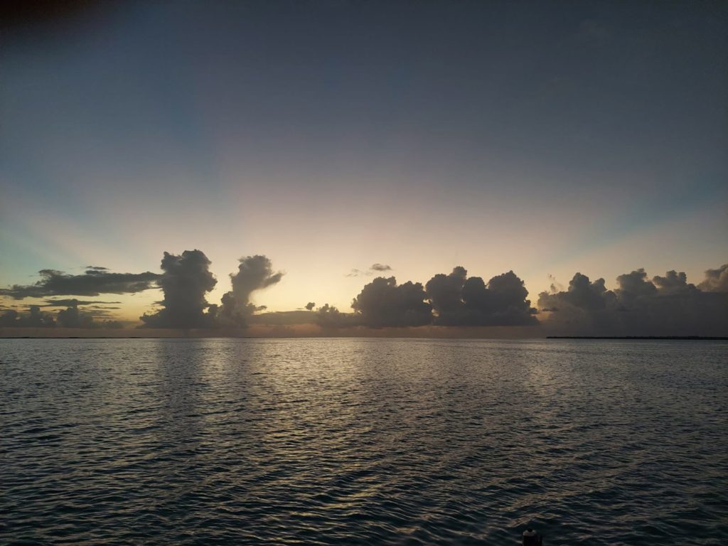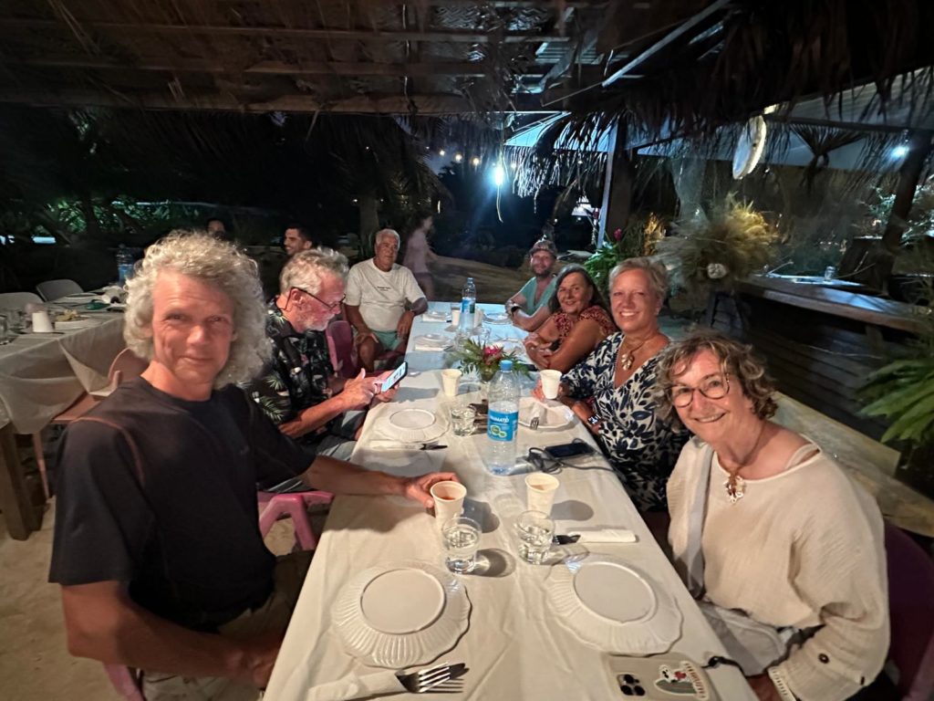 Um kurz nach fünf meldete sich Christine, dass sie mit der Runde fertig sind und am Steg warten. Als sie alle wieder zurück auf dem Boot waren, gab’s für einige noch Kaffee und Kuchen und alle waren begeistert von der kleinen Inselrundfahrt und tolle Fotos wurden in die Gruppe gestellt. Es ist erstaunlich, dass jede Gruppe andere Fotos gemacht hat. Da sieht man auch die verschiedenen Wahrnehmungen. Wir fuhren kurz vor dem Sonnenuntergang nochmal zu unserem vorigen Ankerplatz, von wo aus wir hoffentlich morgen die Mantas sehen werden.