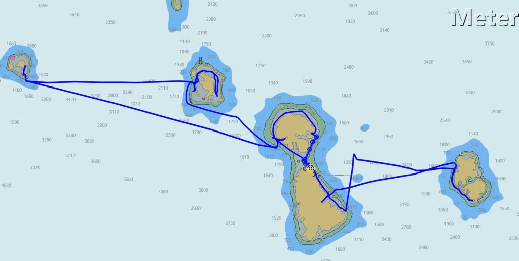 Gesegelte Strecke: 265 sm Max. Speed: 7,9 Kn Max Wind: 40 Kn bei kurzzeitigem Frontdurchgang Bemerkungen: überwiegend Sonnig und sehr warm mit ab und an kurzen Regenschauern, meist in der Nacht. Wassertemperatur zwischen 28 und 30 Grad