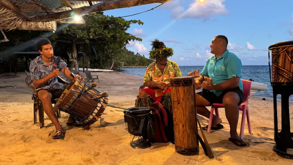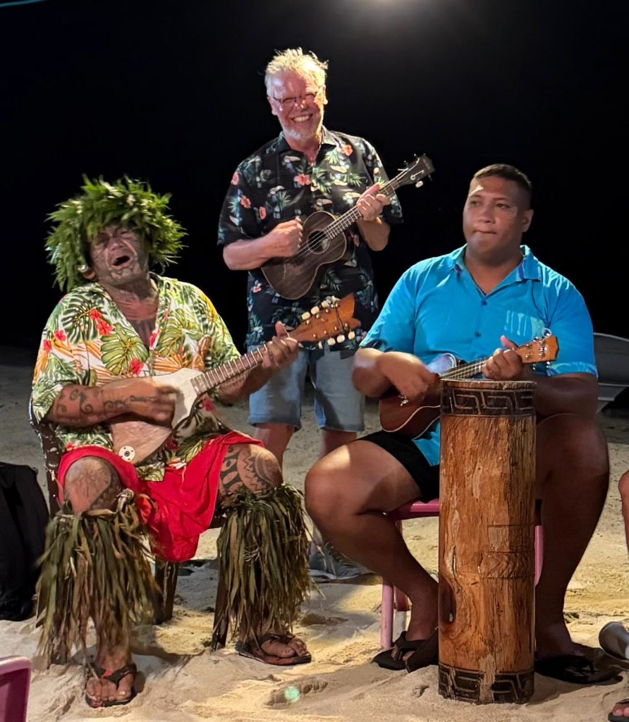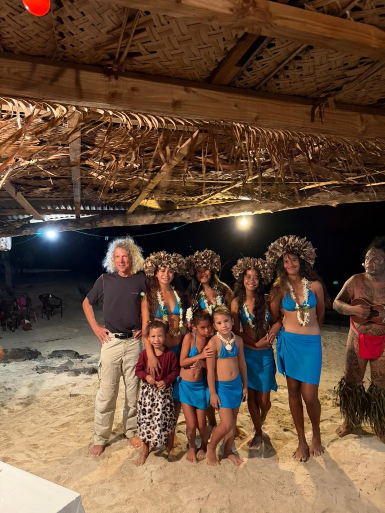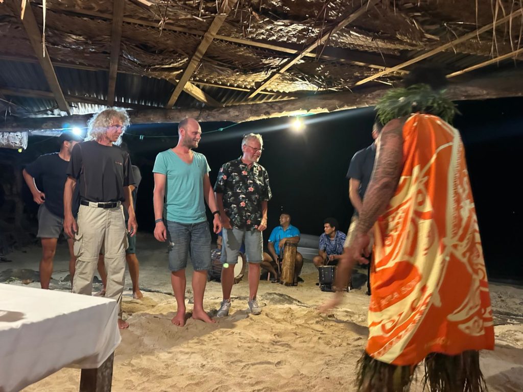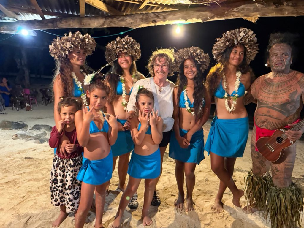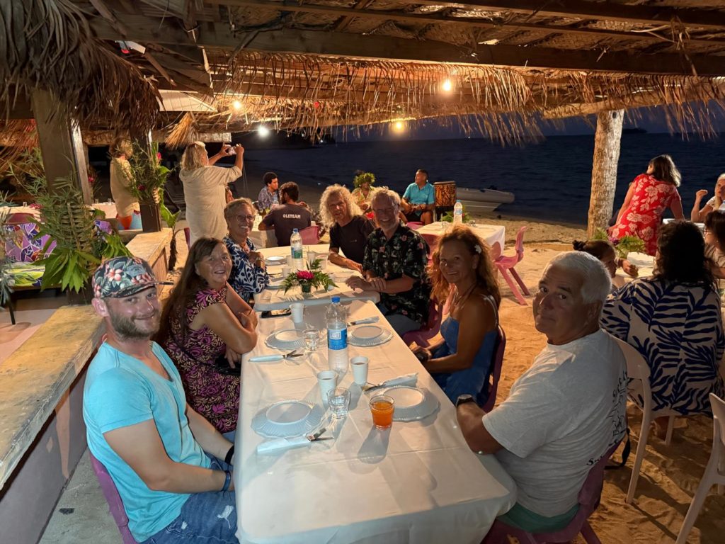Wir hatten noch gut Zeit zum Schwimmen, chillen usw. Um halb sieben stiegen wir alle fein rausgeputzt in das Dinghi zur polynesischen Folklore Show mit Buffet. Wir wurden schon mit Musik empfangen, dann hielt der Chef vom Happy Village eine Willkommensrede und anschließend durften wir ans Buffet. Es gab Poisson Cru, Hähnchen, Schwein, natürlich den Mahi Mahi und leckere Beilagen.