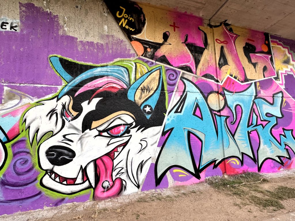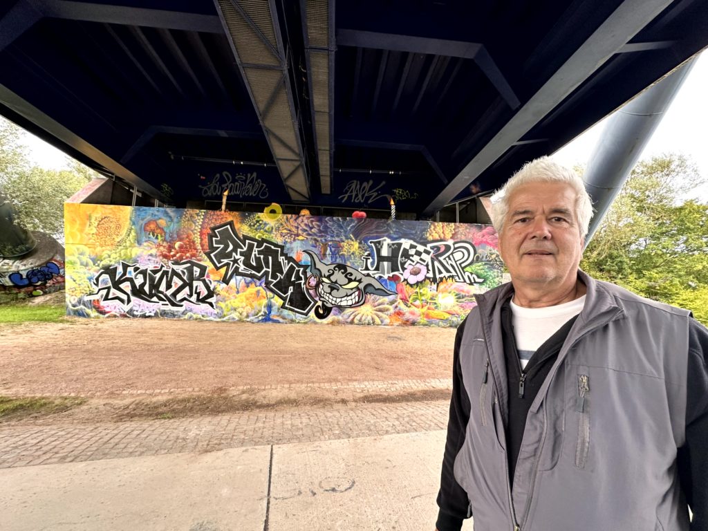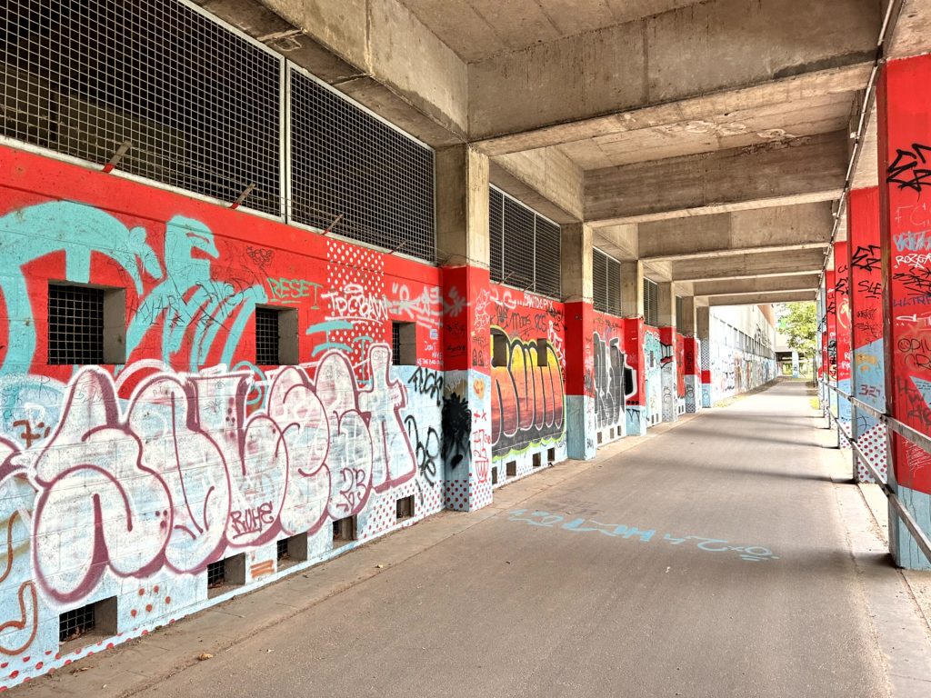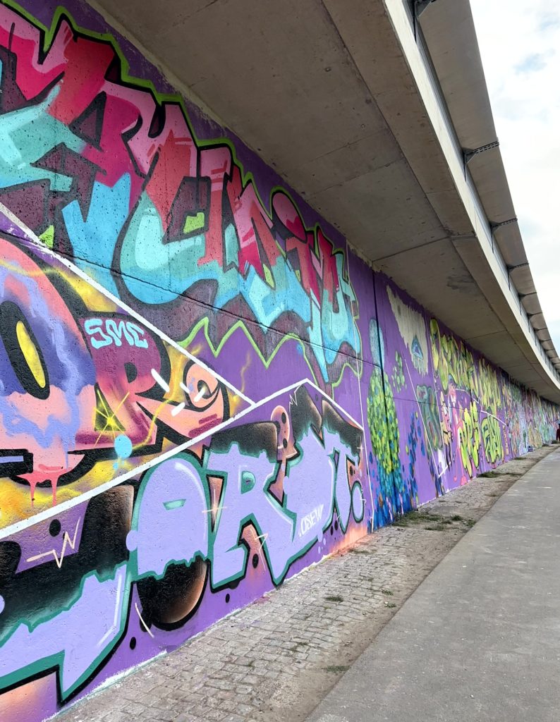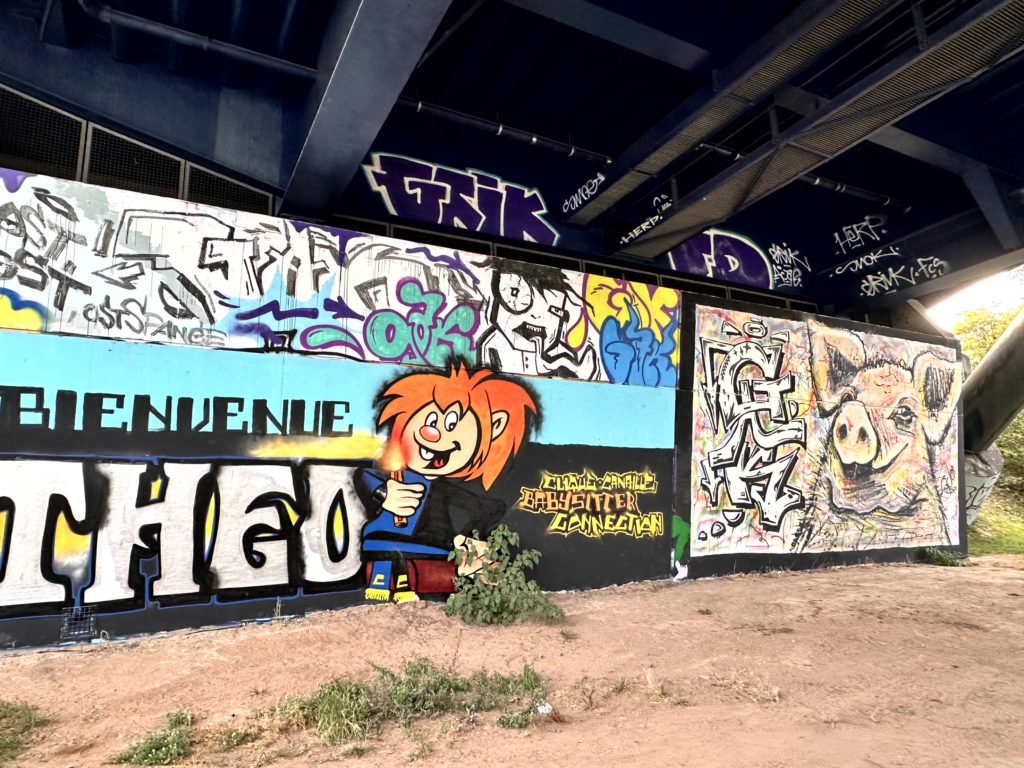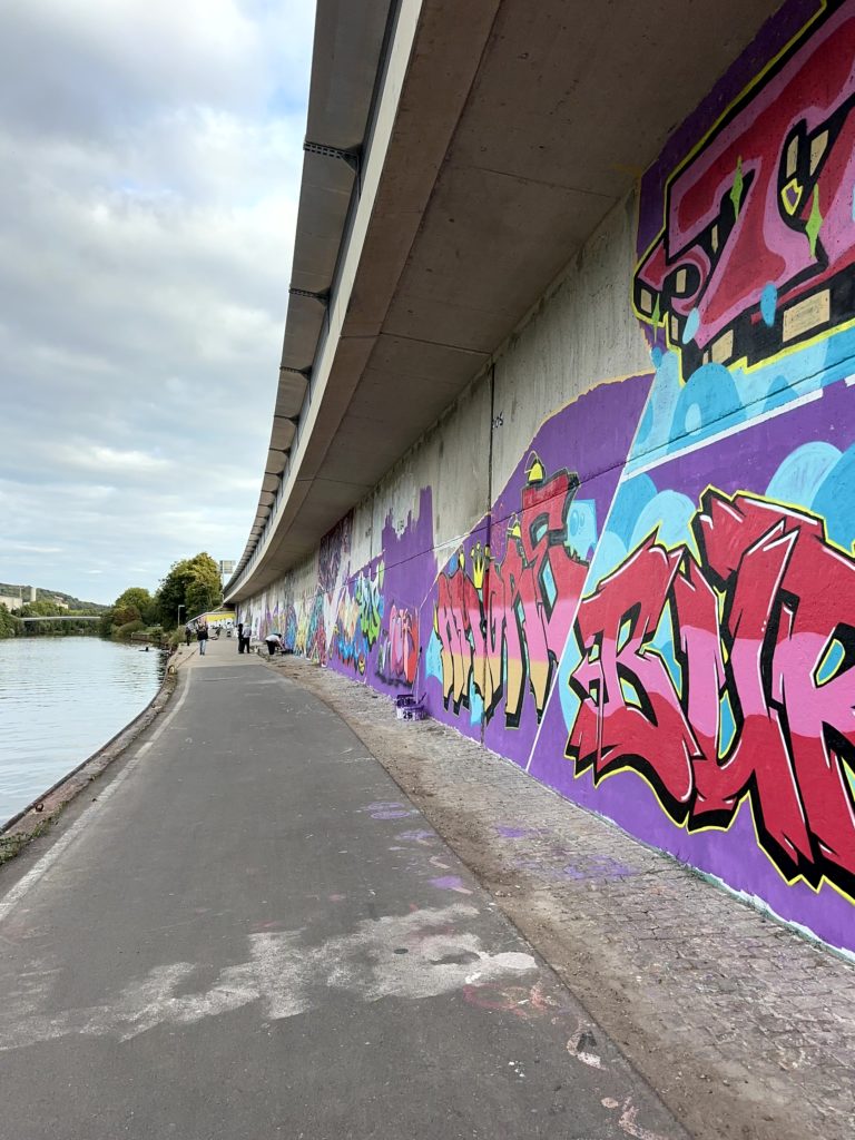 Am Mittwoch waren wir gute 2 Stunden an der Saar entlang spazieren. Am Stadthafen vorbei über eine Brücke auf die andere Seite. Die Betonwände sind nahezu alle voll mit Graffitis und wo noch Platz ist, stehen schon Namen drin, wer sich dort verewigen darf.
