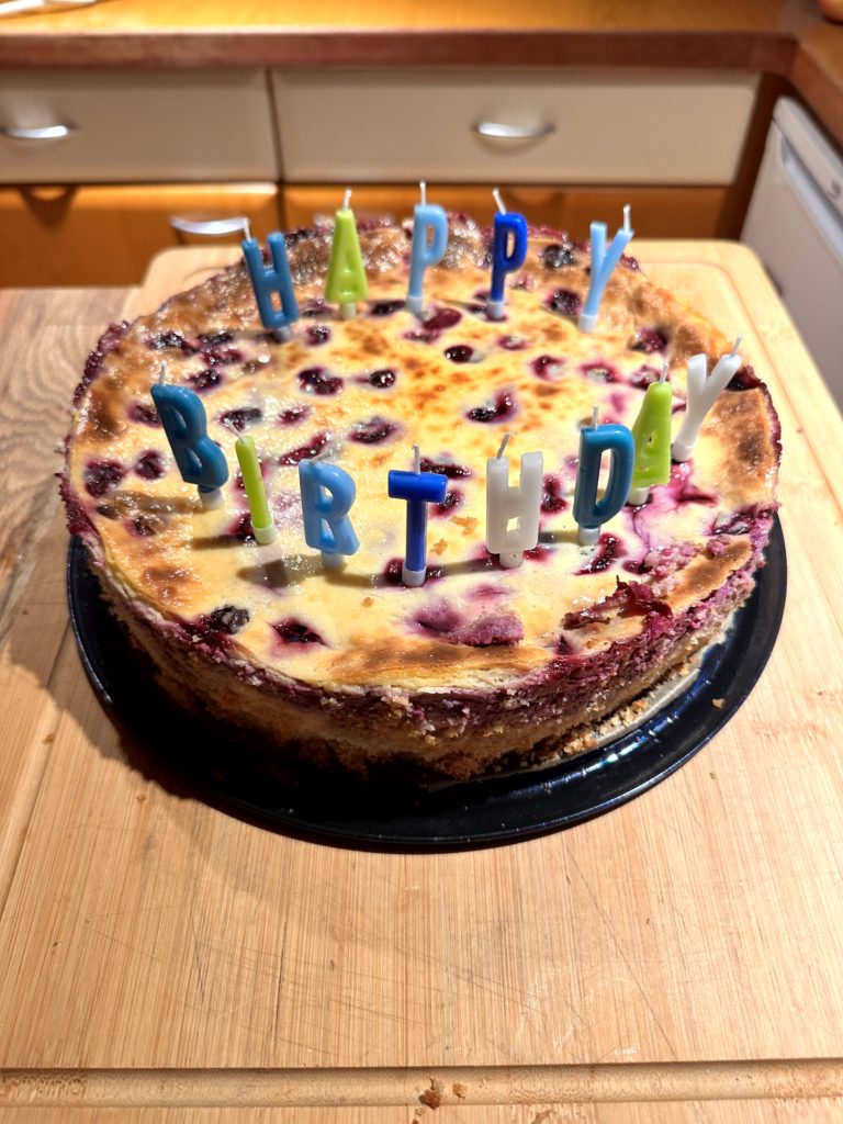 Abends gab’s leckere Tagliatelle mit Lachs und Weißwein/Zitronenmeerrettichsosse. Später bereitete ich noch Martins Geburtstagskuchen vor. Einen Blaubeerkäsekuchen mit Mohn und Eierlikör.