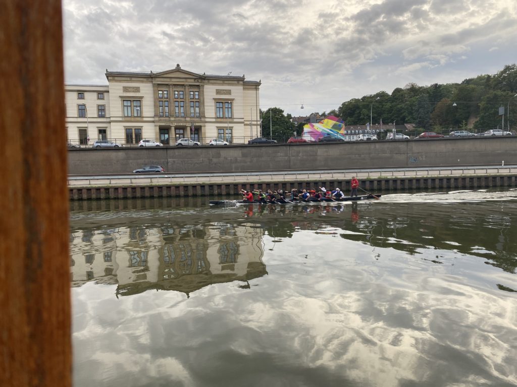 Wir suchten uns einen Platz in einem Eiscafé und ließen uns leckere Eisbecher schmecken . Dann spazierten wir über die Brücke zur Schlosskirche und auf den Schlossplatz. Das Schloss Saarbrücken ist ein barockes Schloss in der saarländischen Landeshauptstadt Saarbrücken. Es befindet sich im Stadtteil Alt-Saarbrücken am linken Ufer der Saar hoch oben auf einen Sandsteinfelsen gebaut. Dort hat man einen tollen Blick auf die Stadt und auf die Saar, wo die Vlinder unterhalb geparkt war. Dann genossen wir die letzten Sonnenstrahlen auf Deck.