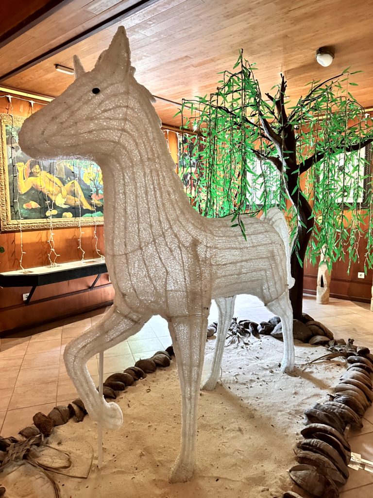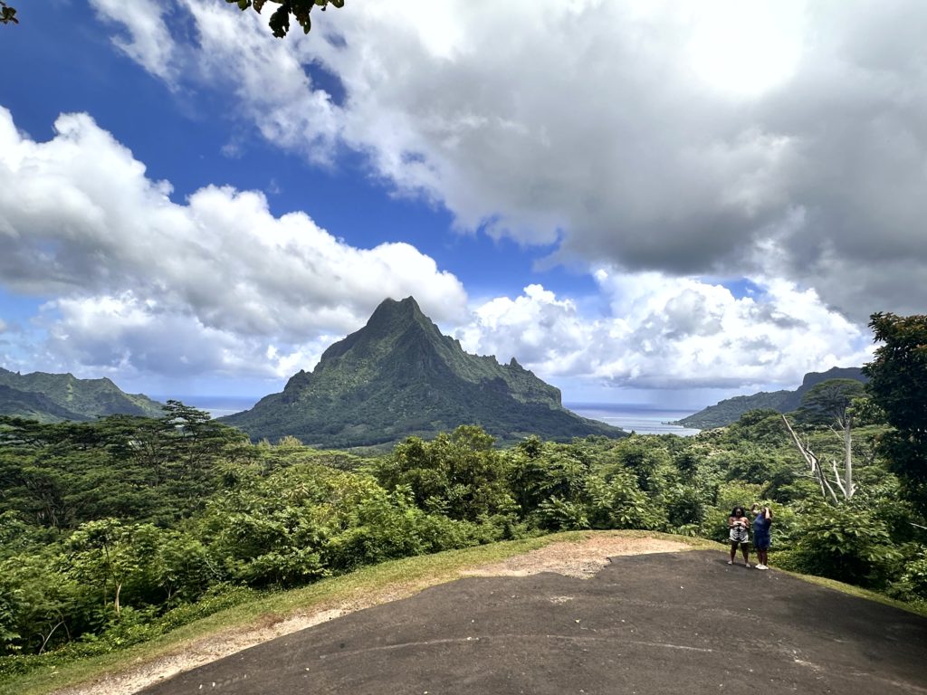 Außerdem hatten wir keine so gute Sicht und es fing zu regnen an. Die Schauer dauern zwar oft nicht lange, trotzdem fuhren wir wieder die steilen Serpentinen hinunter und beschlossen, ins Tiki Village zu fahren. Das ist eine kulturelle Ausstellung und außerdem von berühmten Menschen , die in Französisch Polynesien gelebt und z.bsp. gemalt haben, wie Paul Gauguin.