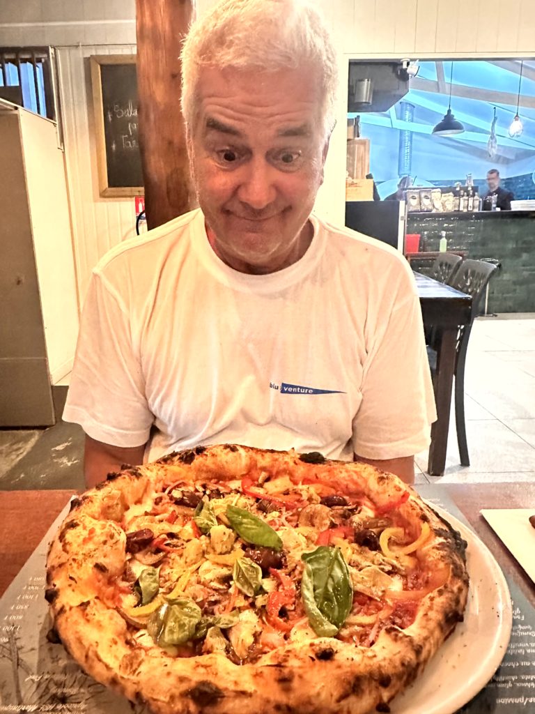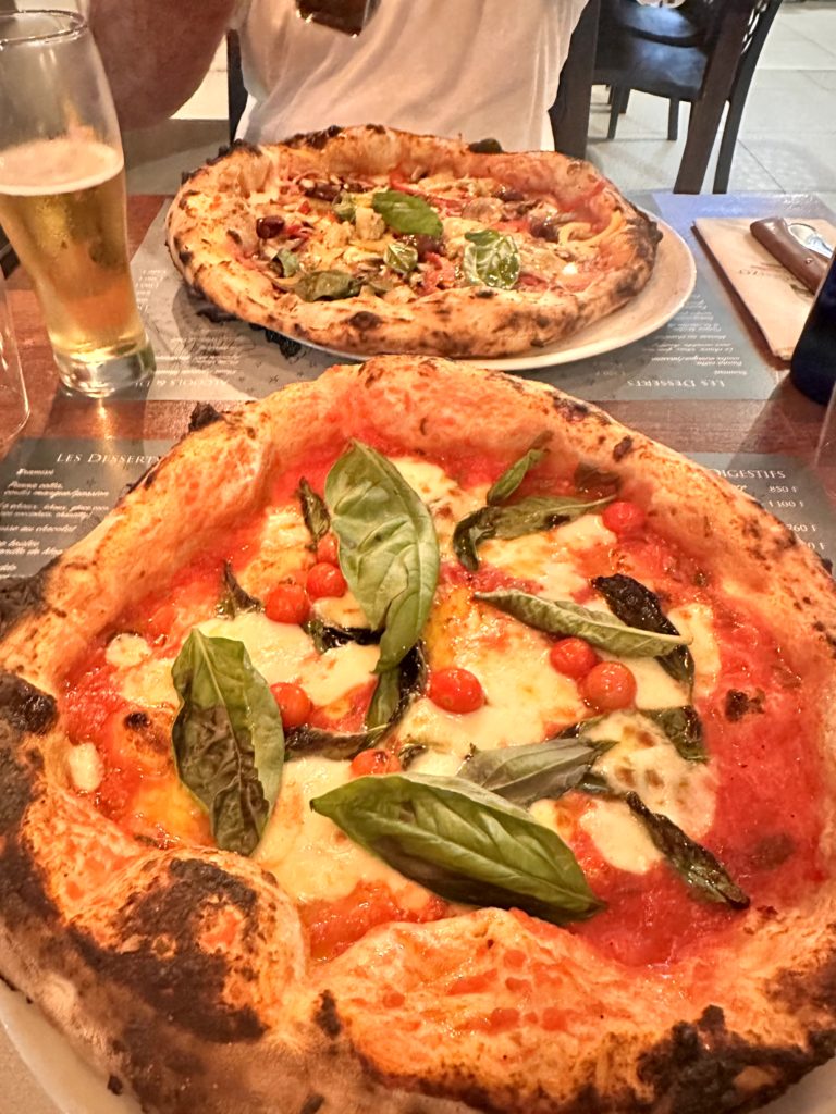 Immer noch hungrig stiegen wir ins Auto und fuhren Richtung Tipanier, wo wir schon mal gegessen hatten. Derweil suchte ich noch auf GoogleMaps nach anderen Gelegenheiten. Die Strandbuden hatten alle schon zu, aber ein italienisches Restaurant war noch auf dem Weg. Sah ganz gut aus. War ziemlich gut besucht, aber für zwei geht eigentlich immer. Sie hatten eine tolle Auswahl an Pizza und Pasta. Wir entschieden uns für Pizza. Das war echt die leckerste Pizza, die ich je gegessen habe. Martin hat danach noch ein Tiramisu gegessen. Das war auch total fluffig und saftig, wie man es eigentlich nur aus Italien kennt. Also rund um ein gelungener letzter Abend auf Moorea. Morgen früh geht’s zurück nach Papeete und mittags geht der Flieger nach Raiatea.