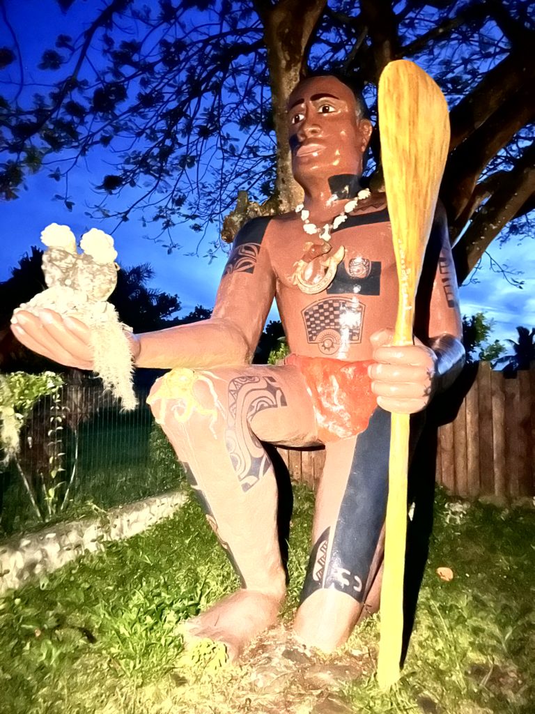 Auf dem Heimweg fuhren wir noch an einem Supermarkt vorbei. Martin wollte noch nach einem Kuchen schauen. Wird Zeit, dass wir aufs Boot kommen und endlich wieder selber backen können. Derweil hat Jeanro geschrieben, dass das Kanu zurück ist. Da es aber immer noch so dick bewölkt war und keine Aussicht auf Sonne, haben wir beschlossen, heute nicht Kayak zu fahren. Scnorchelzeug war schon gepackt, als wieder ein kräftiger Schauer im Anmarsch war. Ok, dann wurde Backgammon gespielt. Zuerst sah es nicht so gut für Martin aus, am Ende war es dann doch unentschieden. Beim Kniffeln hab ich ihn dann leider ausnahmsweise abgezockt, die letzten Male hat er immer haushoch gewonnen. Spät am Abend wollten wir noch zu einem kleinen Restaurant in der Nähe spazieren. Leider hat der Besitzer noch einen Schließtag auf seine Tafel gekritzelt und zwar Dienstag. Also , zu Fuß wieder 10 Minuten zurück. Da kamen wir an einer riesigen Figur vorbei. Das war kein Tiki, sondern ein Einheimischer. Vielleicht erfahren wir die Bedeutung noch. Im Dunkeln sah er echt bedrohlich aus. Martin beleuchtete ihn mit seiner Handylampe, damit wir wenigstens ein Foto machen konnten.
