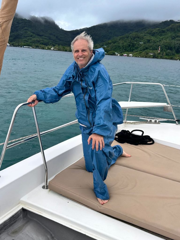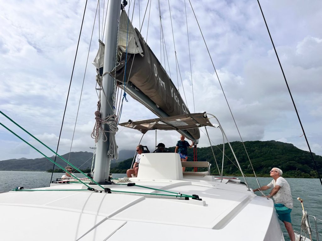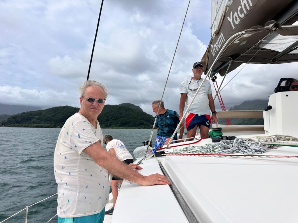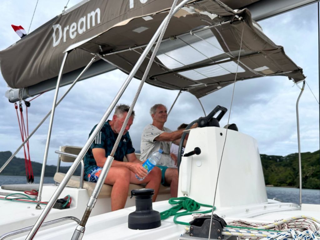 Heute hieß es gleich nach dem Frühstück Anker auf Richtung Huahine. Der Sturm hat Gottseidank etwas nachgelassen und die Sonne ließ sich auch öfter blicken. Trotzdem mussten wir alles gut Wetter und Wellenfest verstauen. Die letzten drei Tage war die Crew ja schon sturmerprobt. Kaum raus aus der Bucht wurde das Großsegel und die Fock gesetzt.