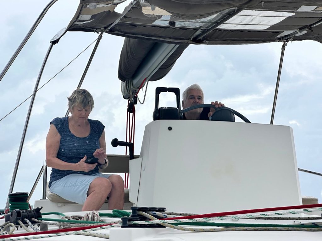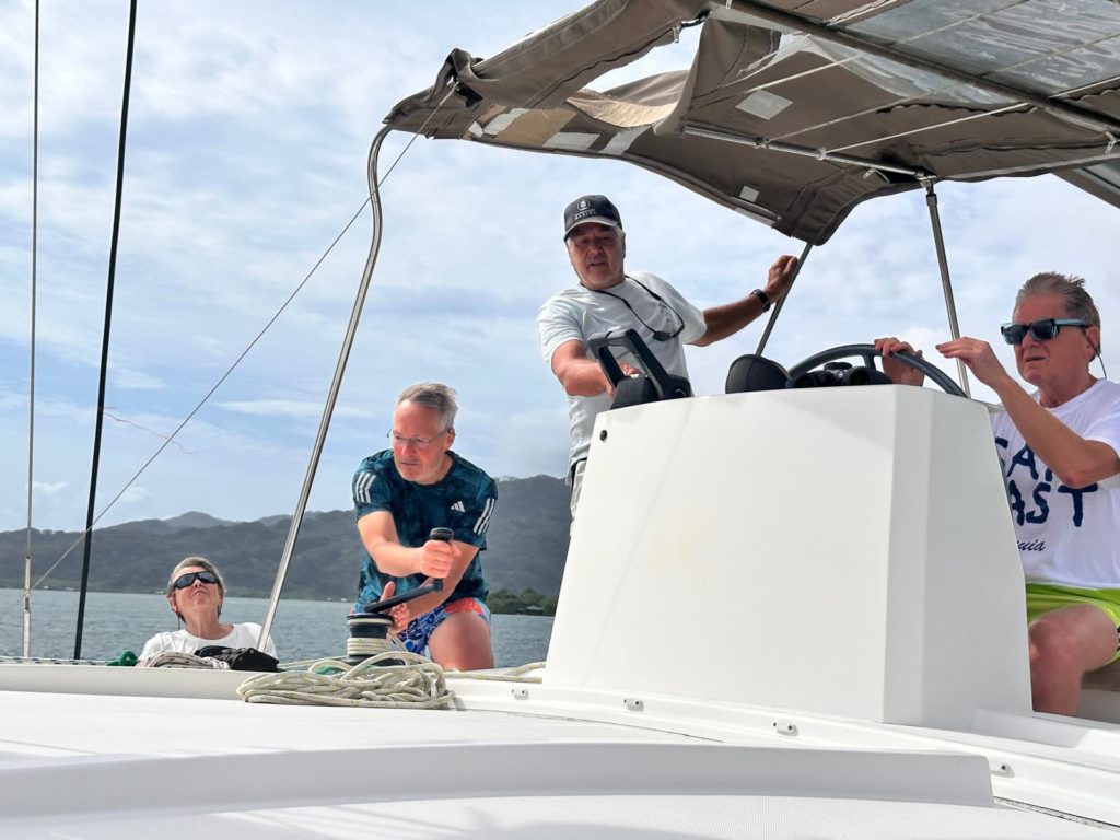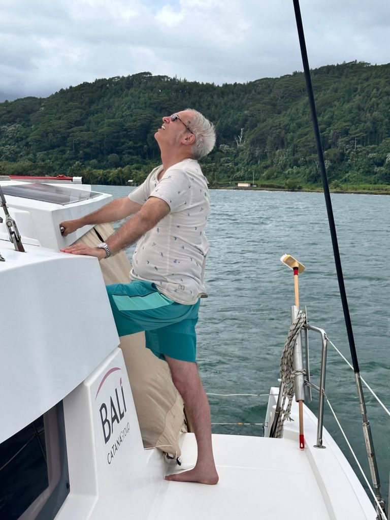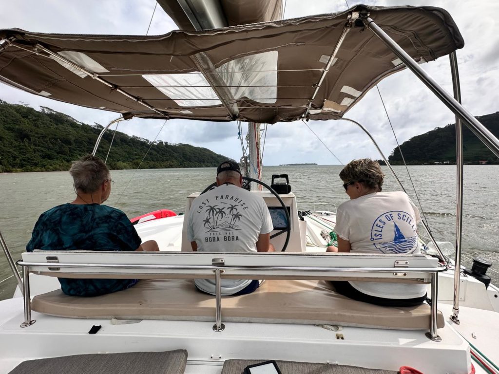 Heute hieß es gleich nach dem Frühstück Anker auf Richtung Huahine. Der Sturm hat Gottseidank etwas nachgelassen und die Sonne ließ sich auch öfter blicken. Trotzdem mussten wir alles gut Wetter und Wellenfest verstauen. Die letzten drei Tage war die Crew ja schon sturmerprobt. Kaum raus aus der Bucht wurde das Großsegel und die Fock gesetzt.