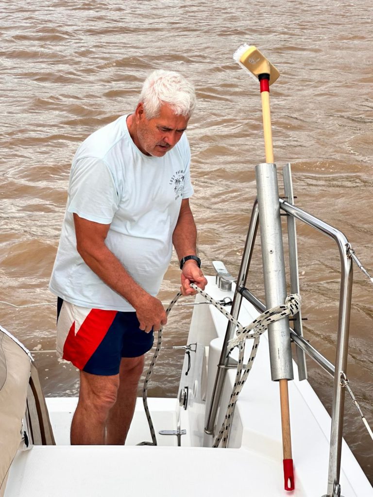 Zum Ankerbier sagten die Jungs nicht nein. Kurz bevor es dunkel wurde, sprangen noch alle zur Abkühlung ins Wasser. Waltraud und Norbert bereiteten zum Abendessen ein leckeres Curry vor. Heute hatte auch keiner mehr Lust auf ein Wizzard. Nach dem langen und anstrengenden Schlag gingen fast alle zeitig in die Kojen.