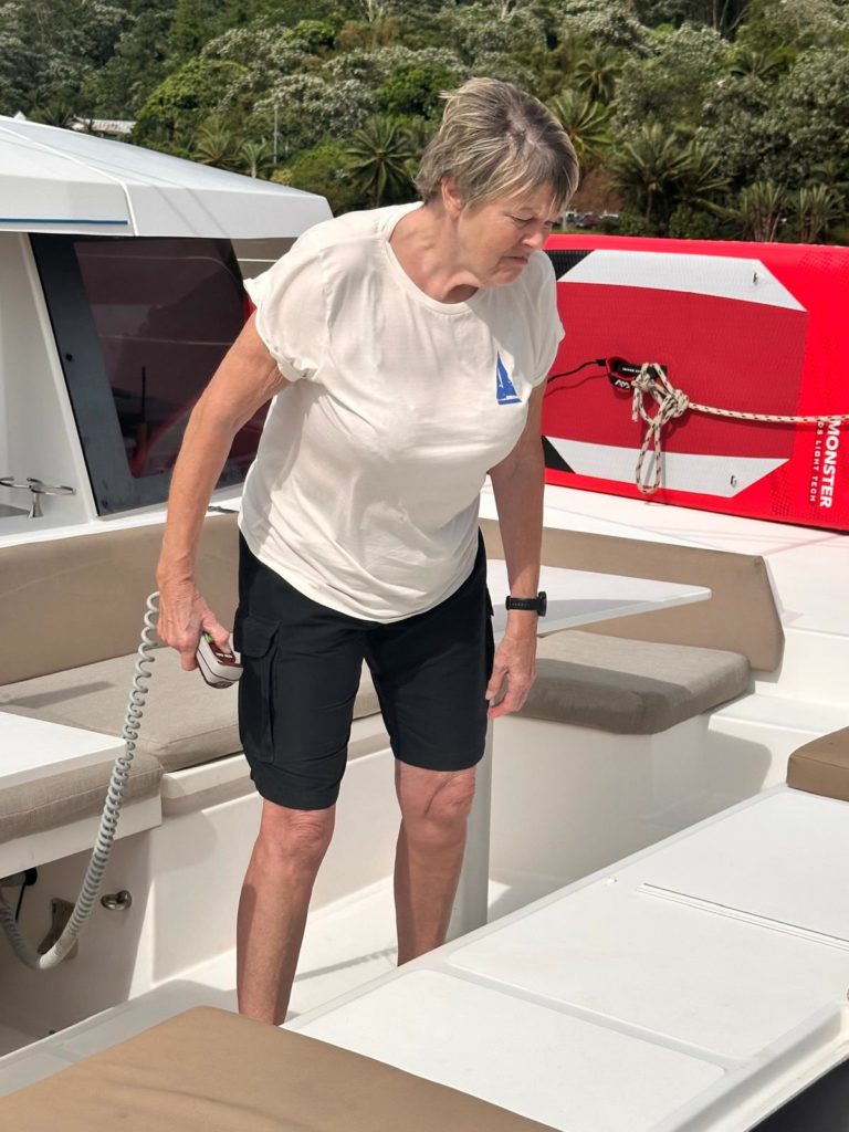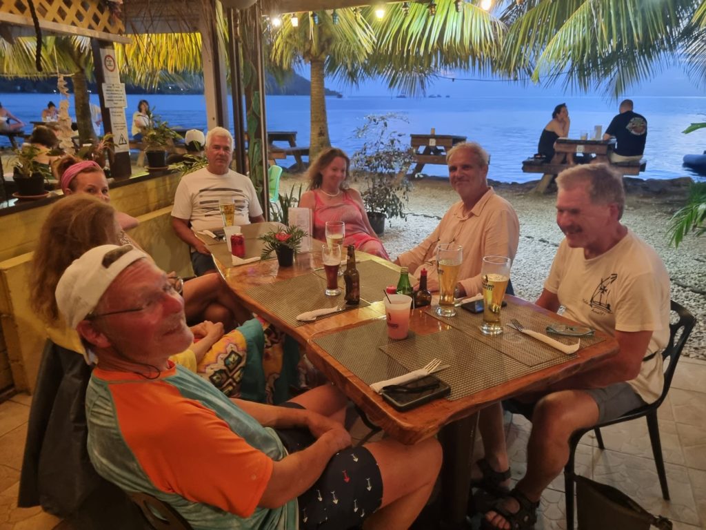 Als wir das zweite Mal rüber fuhren, saßen schon alle gutgelaunt bei Bier, Kaffee und Cocktails im Yachtclub. Die Crew wollte gleich sitzen bleiben bis zum Abendessen. Götz fuhr mit aufs Boot zurück zum Umsetzen und um an die Boje zu fahren. Die war sehr kurz angeleint, deswegen hat Götz das vom