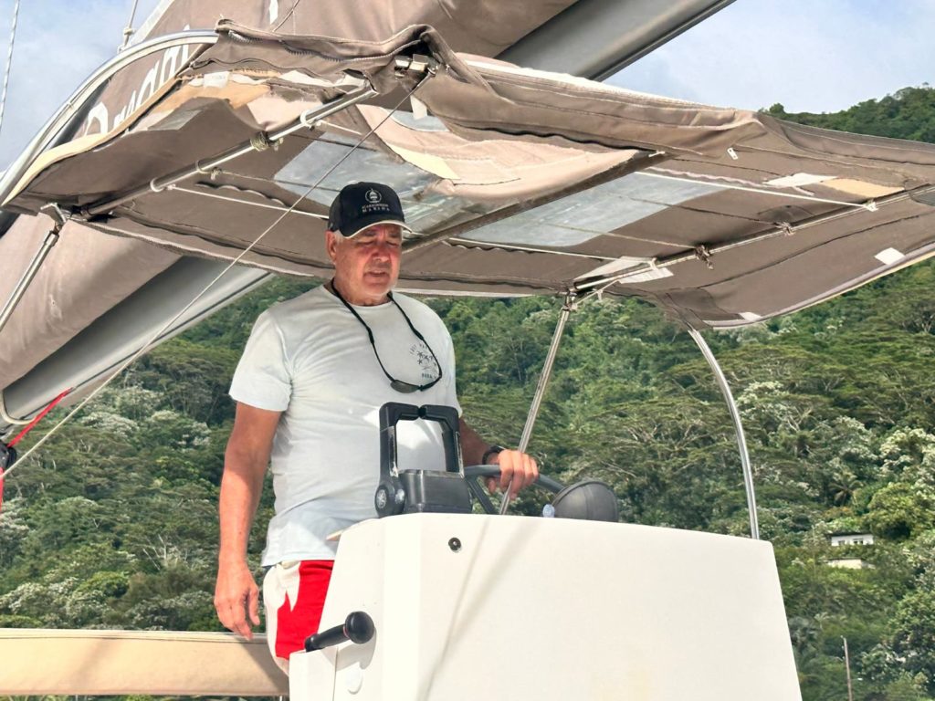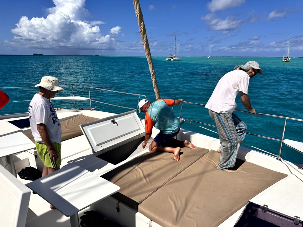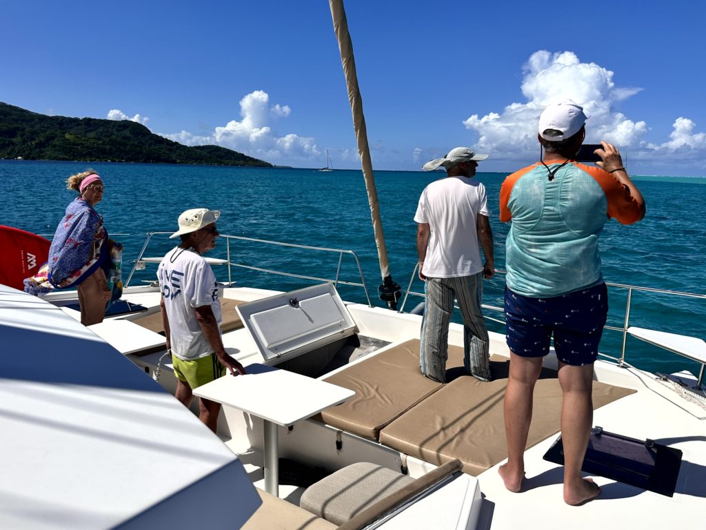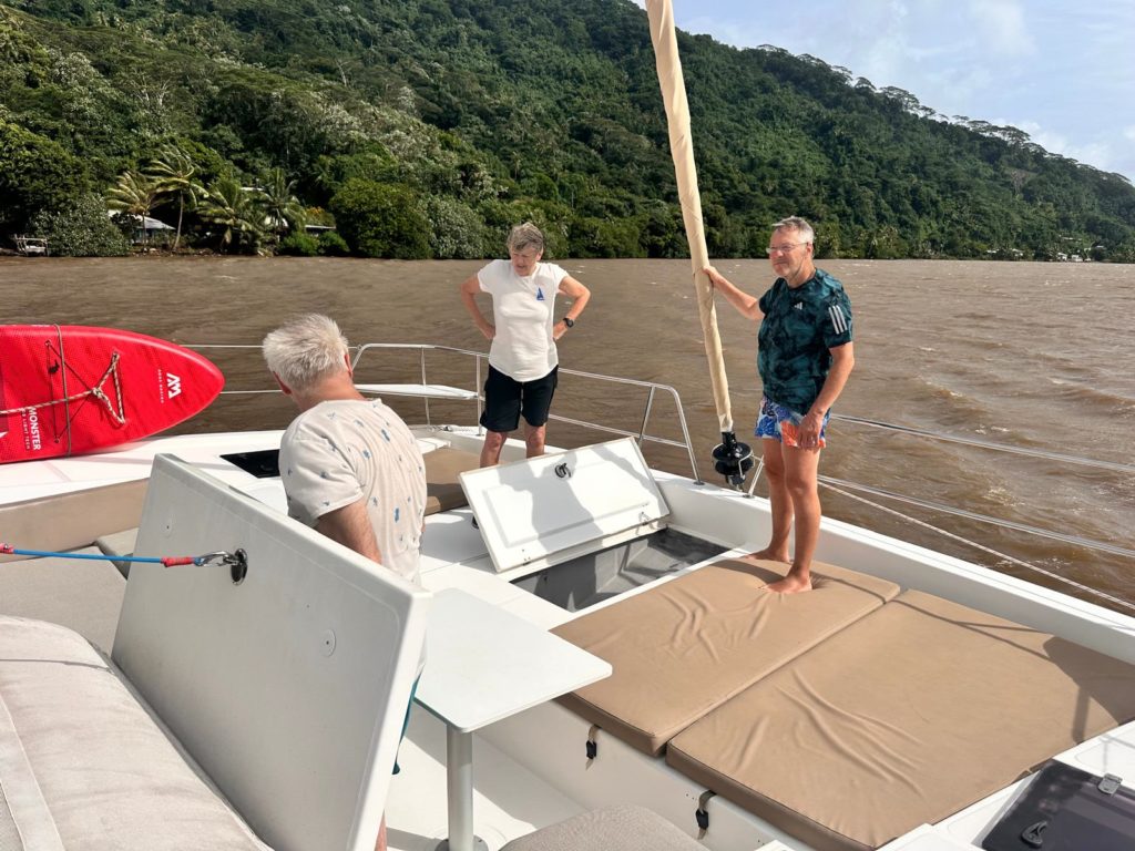Nach dem Frühstück hieß es Anker auf Richtung Norden. Da wollten wir vor dem Hauptort der Insel , Fare, ankern. Es regnete wiedermal. Norbert und Götz sahen in ihren Regenjacken aus, als segelten sie in der Nordsee, aber nicht wie in der Südsee. Wenigstens war es warm. Doch je weiter wir unserem Ziel näher kamen, je mehr klarte der Himmel auf. Das Ankern mit dem eingespielten Team klappt reibungslos.