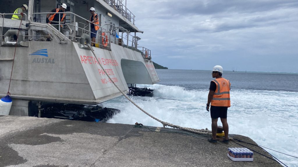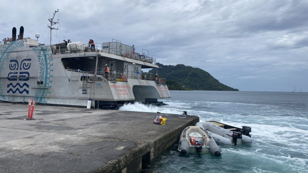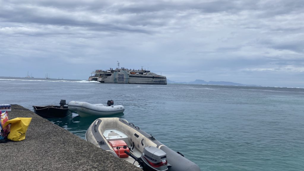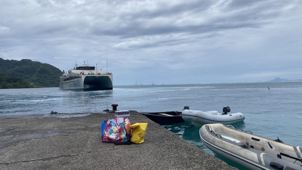 Zwischendurch kam noch die große Katfähre aus Papeete vorbei und blockierte mit ihren Festmachern unser kleines Dinghy.
