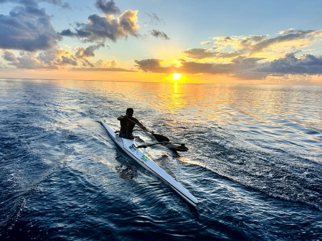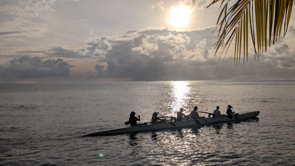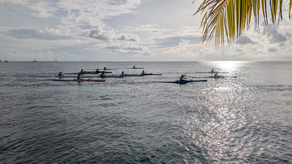 In der Heckwelle fuhren abwechselnd zwei Insulaner mit ihren Auslegerkanus mit. Das war echt cool, das zu sehen.