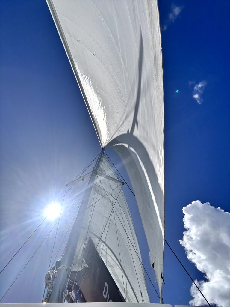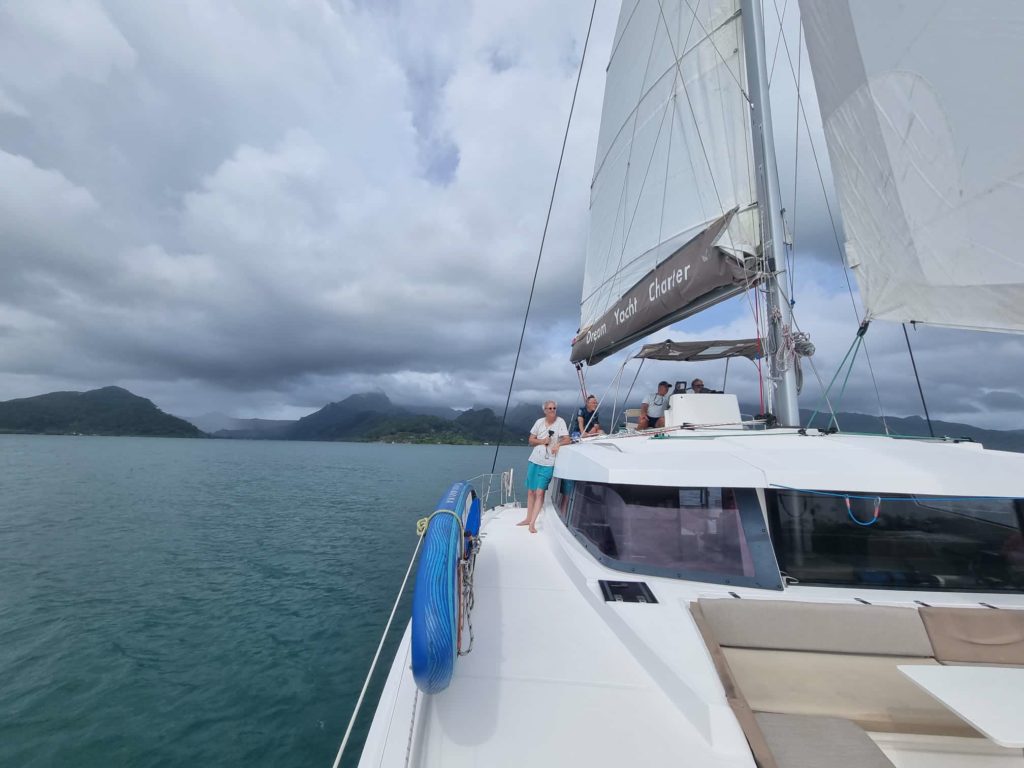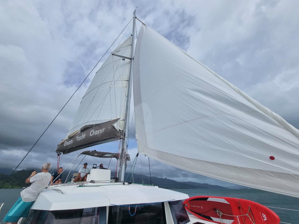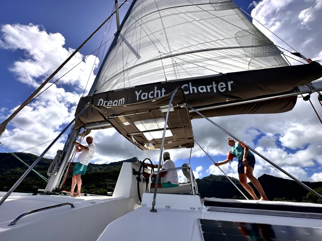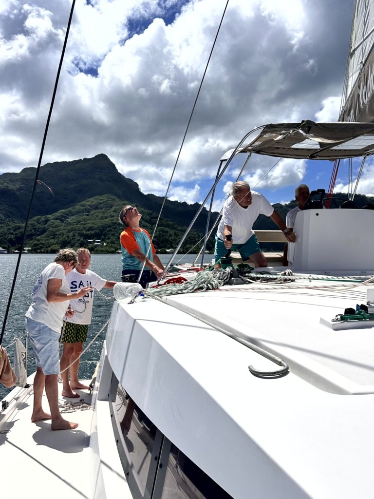 Aber dann kam das Kommando zur Abfahrt und los ging es Richtung Taha‘a. Martin drehte in den Wind, damit das Großsegel gesetzt werden konnte und danach die Fock. Ganz anders als am Samstag gleitete das Schiff schön ruhig über die Wellen.