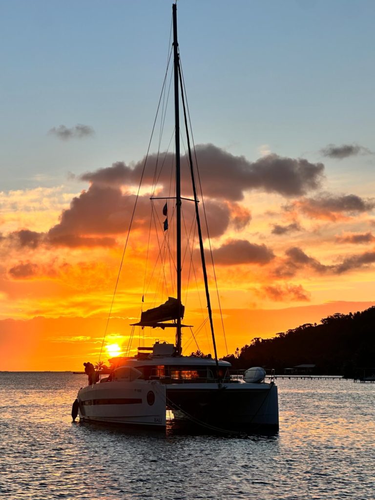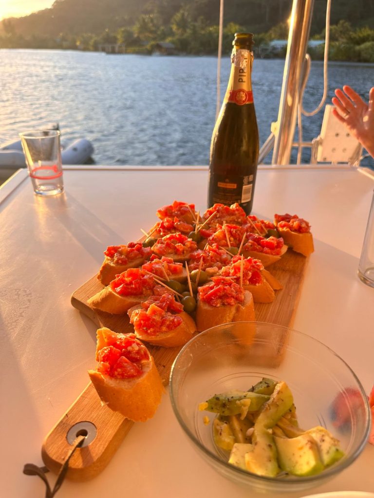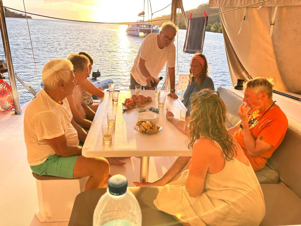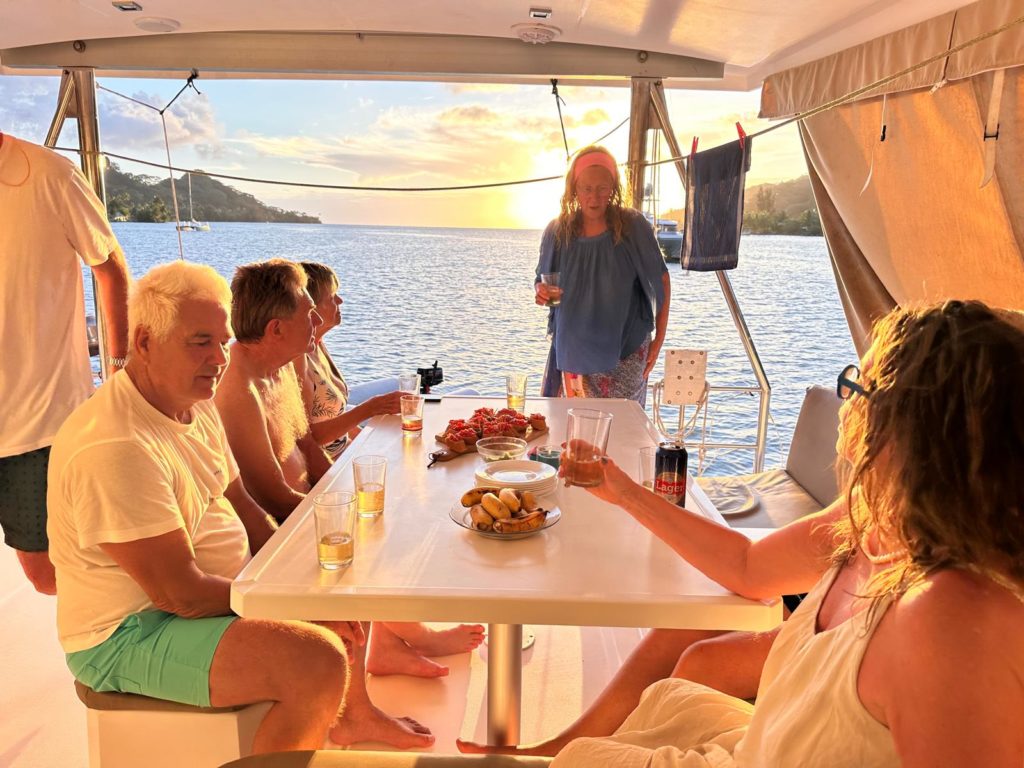 Vor dem Abendessen hüpften einige noch ins Wasser und Götz paddelte mit dem SUP durch die Bucht. Unsere Nachbarn von Huahine, die überfallen wurden, lagen jetzt wieder neben uns . Götz fragte , wie die Sache ausging. Das wird im Sand verlaufen, da wird nichts rauskommen.