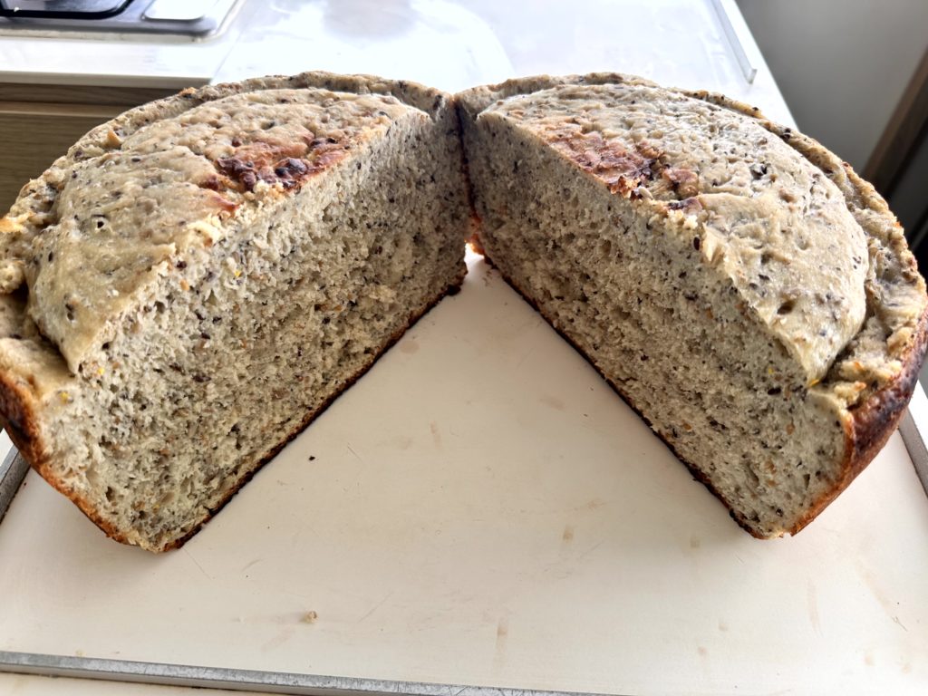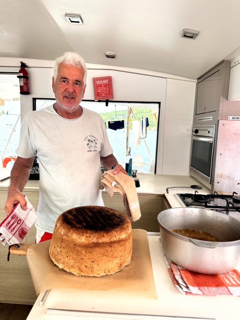 Derweil probierte ich Bananenchips aus den Kochbananen. Die waren schon sehr reif, sind aber trotzdem gut geworden. Die leichte Schärfe vom Chili und die Süße der Banane sind eine gute Kombination. Katrin hat sich heut Abend eine Brotzeit gewünscht. Deswegen habe ich noch einen Krautsalat und einen Tomaten/Feta Salat gemacht. Waltraud und Norbert machen wieder den Thunfischdip, wenn sie von der Tour zurück sind. Nachdem ich in der Küche fertig war, hat Martin sein Skipperbrot gebacken.