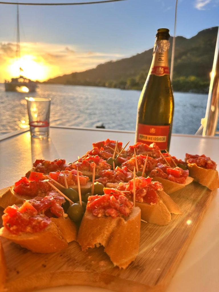 Um drei gab’s dann Kaffee und Käsekuchen. Während der schönen Sonnenuntergangsstimmung haben wir nochmal auf Katrin mit Sekt angestoßen und es gab einen kleinen Snack dazu.