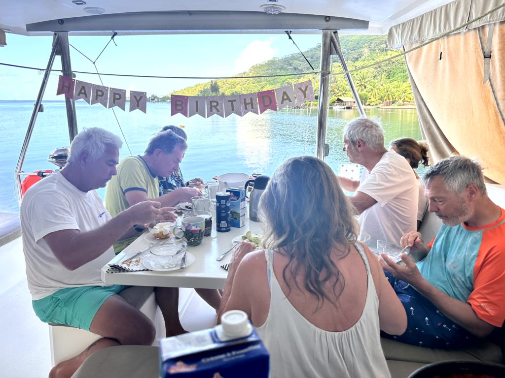 Da die Crew heute eine Halbtagestour mit Vanilla Tours machen wollte, war Frühstück schon um halb acht angesagt. Ich hatte ja gestern schon Geburtstagsgirlanden aufgehängt und heute Morgen den Tisch schön gedeckt . Gut, dass das Wetter gehalten hat, die Sonne strahlte auch schon am Himmel. Perfektes Geburtstags und Ausflugswetter. Alle waren schon oben als Katrin aus ihrer Kabine kam. Ein Geburtstagsständchen tönte aus Martins Musikbox. Nachdem alle gratuliert haben, gab es Frühstück. Katrin war total überrascht und hat sich sehr gefreut.