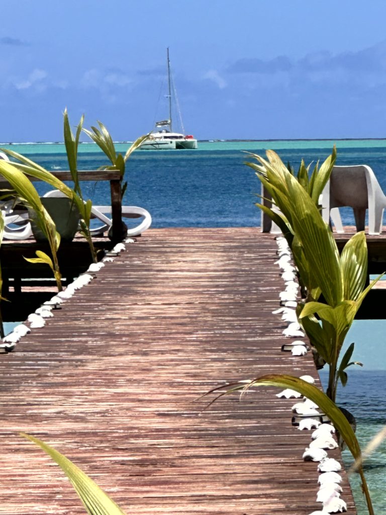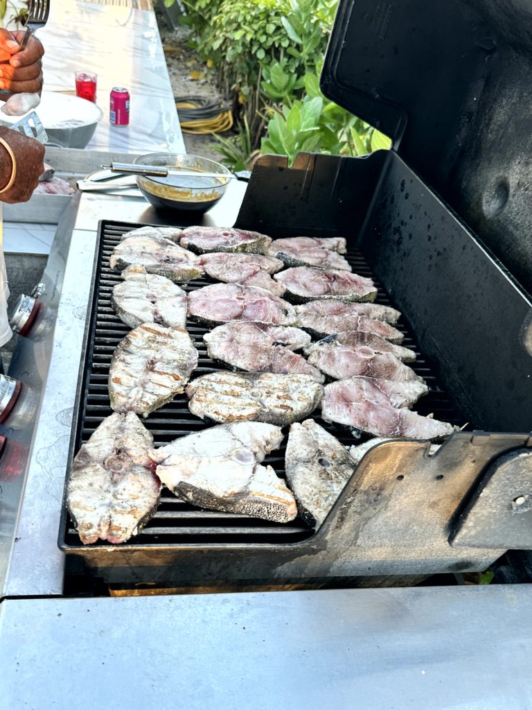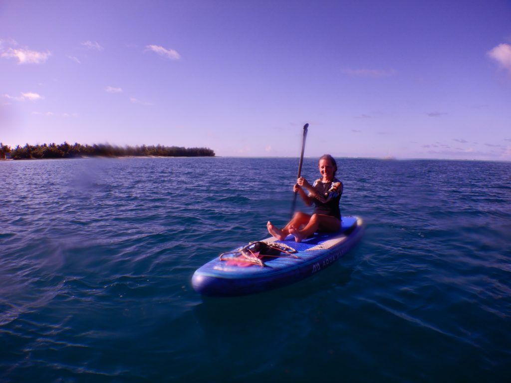 Ich paddelte den Skipper zurück aufs Boot und wir erzählten von dem Plan. Da meinte Katrin, wenn das schon so eine schöne Location ist, könnten wir doch auch dort essen. Alle waren einverstanden. Also zurück aufs SUP, dieses Mal mit Ute als Passagier. Am Restaurant angekommen, nahmen sie gerade die Fische aus, die es am Abend geben sollte. Zwei schöne große MahiMahi wurden fachgerecht zerlegt. Ute sprang derweil ins Restaurant und reservierte uns einen Tisch.