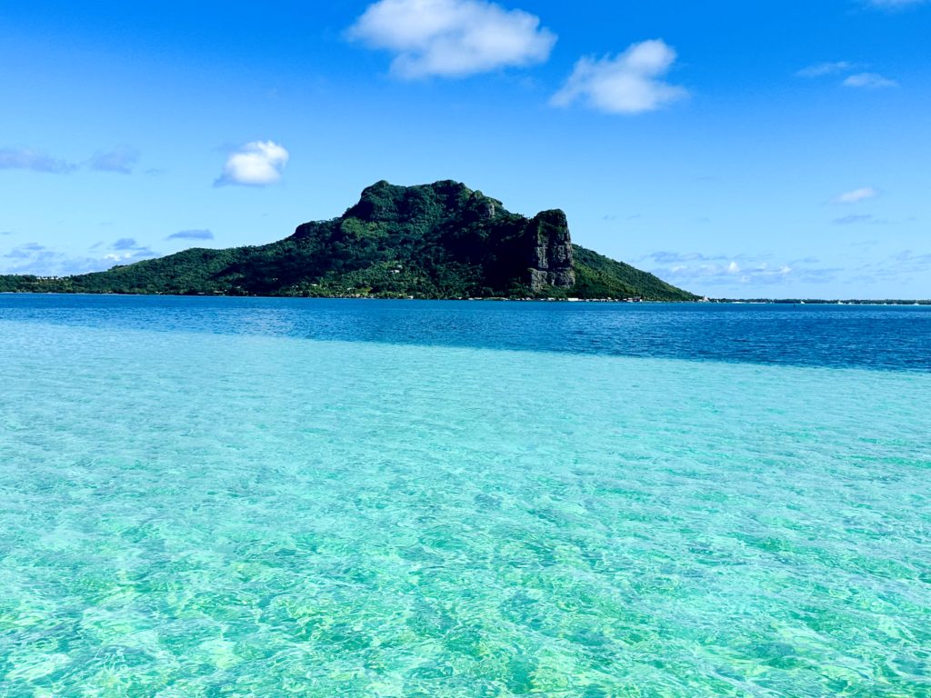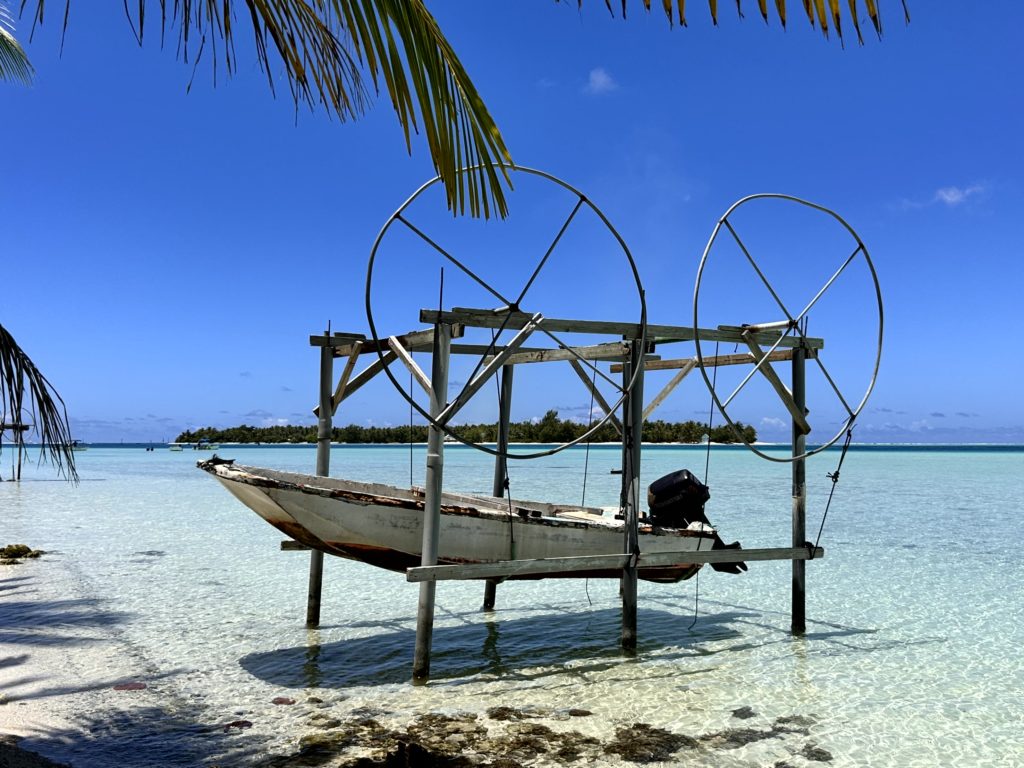 Schnell schwammen wir zu der Stelle und in ca 5-6 Meter Tiefe gleitete wirklich ein großer Manta durchs Wasser. Matthias hat noch einen zweiten gesehen und folgte ihm. Wir blieben bei dem einen und beobachteten ihn fasziniert. Martin tauchte runter und hat ein paar tolle Aufnahmen von ihm gemacht. Das war unser erstes Highlight des Tages. Dann hatten wir ein leckeres Frühstück vor einer traumhaften Kulisse. Highlight Nr 2 . Diese Farben kann kein Foto festhalten. Danach schnappten Martin und ich ein SUP, um auf das MOTU Tiapaa zu paddeln. Der Chef hat sich natürlich wieder durch das glasklare türkise Wasser chauffieren lassen.