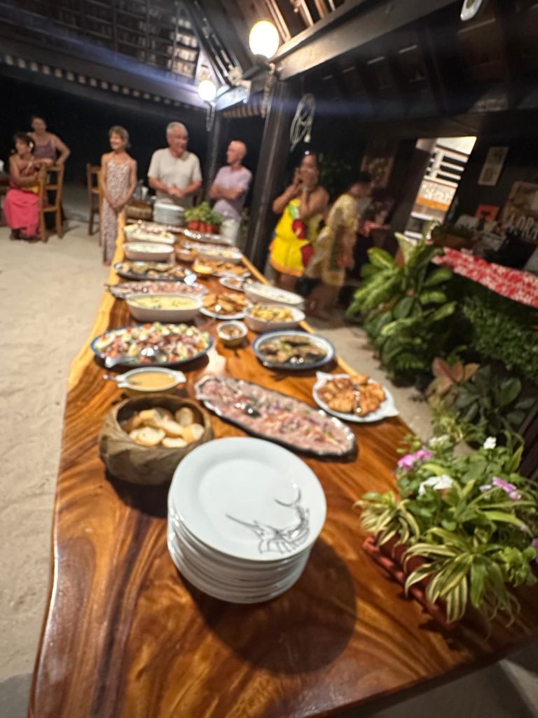 So nach und nach kamen die Hotelgäste und bewunderten auch den schönen Sonnenuntergang. In der Zeit wurde das Buffet aufgebaut. Alle Gäste wurden zu dem großen Tisch gebeten. Die Chefin und die Köchin erklärten die leckeren Gerichte. Dann wurde noch ein Gebet gesprochen und die Musik begann zu spielen.