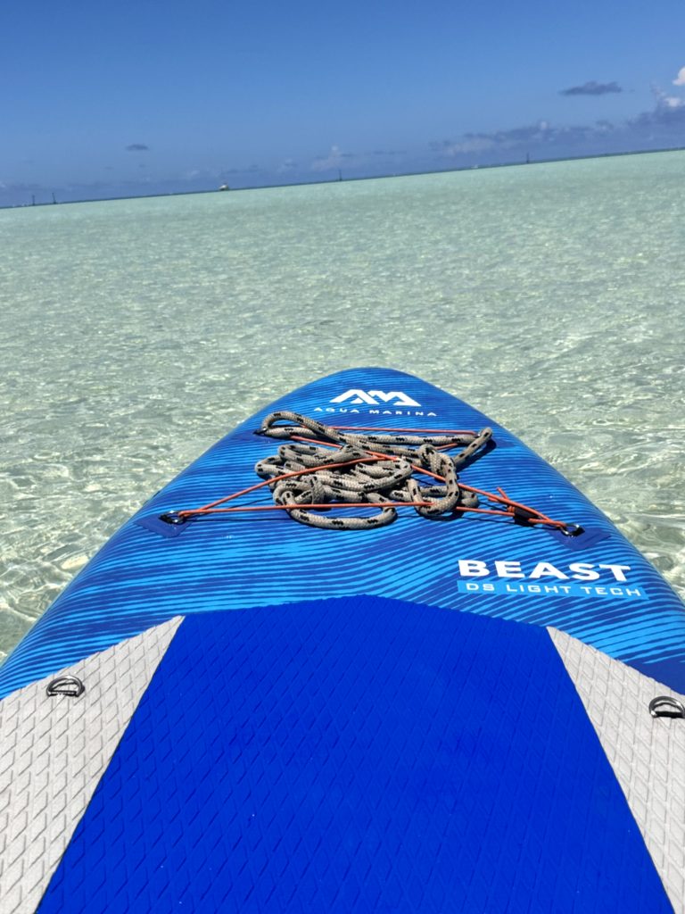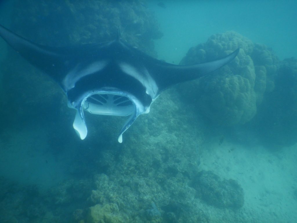 Heute Früh noch vor dem Frühstück sind wir mit dem Dinghi an den Mantaspot gefahren. Ich hab das SUP genommen. Dinghi und SUP wurden an der Boje fest gemacht und dann ging es auf die Suche.