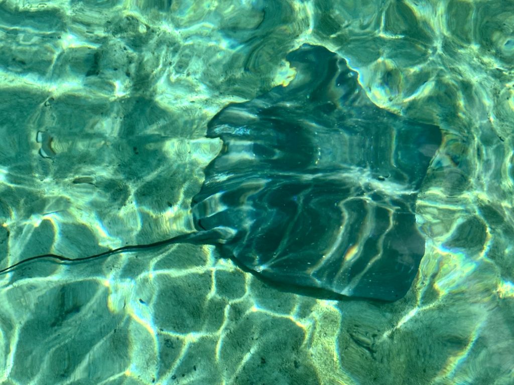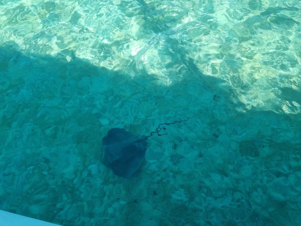 Zurück an Bord gab’s Kaffee und Kuchen . Danach sprangen alle ins Wasser, das war einfach zu verlockend. So klar und warm wie in der Badewanne. Ab und zu kreisten ein paar Rochen ums Boot.