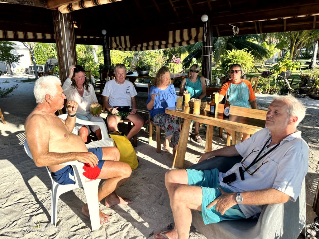 Jetzt durften die Gäste ans Buffet. Viel frischen Fisch. Alles war so lecker. Das Highlight Nr 4. Als Nachtisch gab es einen fluffigen Kuchen. Glücklich und zufrieden fuhren wir mit dem Dinghi aufs Boot zurück. Katrin und Götz wollten draußen schlafen und zogen sich aufs Oberdeck zurück. Martin hatte noch am Laptop zu tun und ich fasste unsere tollen Erlebnisse für den Blog zusammen. Ein wundervoller Tag mit vielen Highlights im Paradies ging zu Ende.