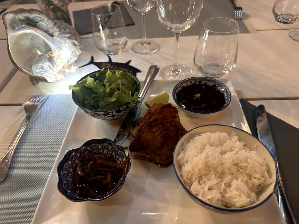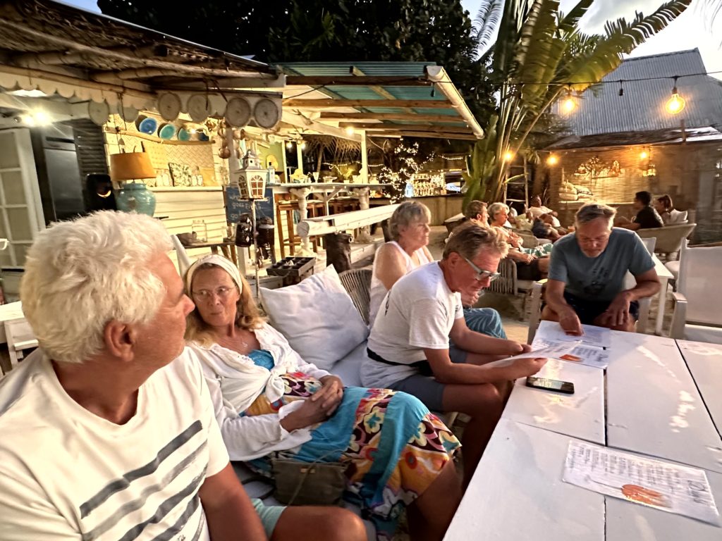 Kurz vor der Marina kam das Tenderboot mit den Jungs, die uns abholen sollten um unsere „RASDU“ in die Marina zu Fahren. Sie machten sich auch gleich nach dem Anlegen an die vielen kleineren Reperaturen, die Martin schon vorher auf einer Mängelliste in die Marina geschickt hat. Kaum waren wir an Land, ging ich in die Stadt, um im La Raie Gatè zu reservieren. Leider hatten die Abends geschlossen. Derweil schickte Helene vom zweiten Törn ein tolles Foto von einer wunderschönen Location, und wollte dort für Freitag reservieren. Dann meinte Waltraud, wir könnten doch auch dort essen gehen. Planänderungen funktionieren hier immer besonders gut. Fein rausgeputzt stiegen alle , bis auf Ute, ins Taxi. Helene und Sylvia vom nächsten Törn wollten dort auf uns warten.