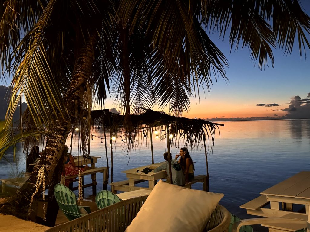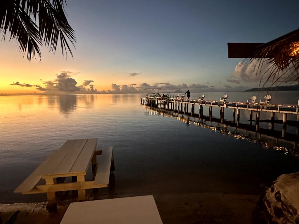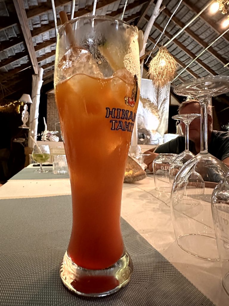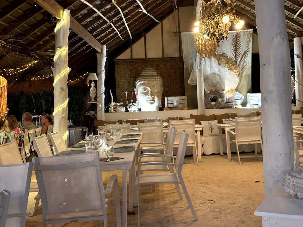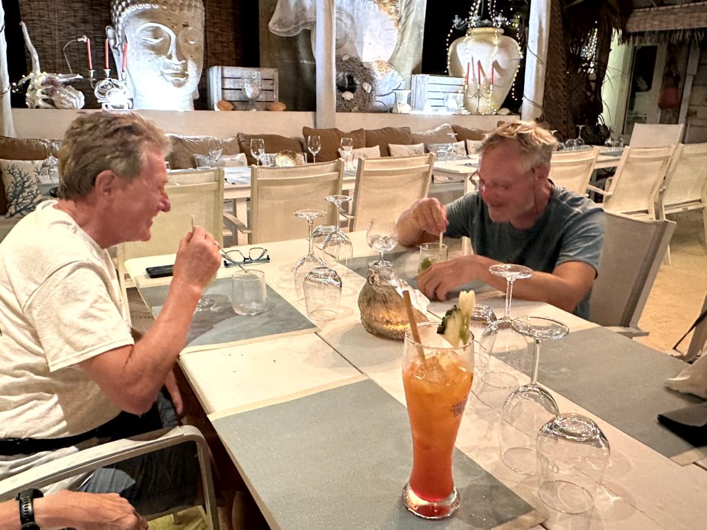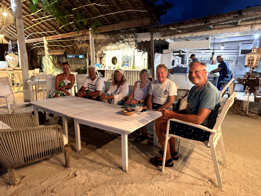 Als wir das Restaurant Fish and Blue betraten, waren alle total angetan. Wir konnten noch das Farbenspiel am Himmel vom Sonnenuntergang bei einem Sundowner beobachten . Martin und ich begrüßten schnell noch Helene und Sylvia, die einen besonders schönen Platz direkt im/am Wasser hatten.