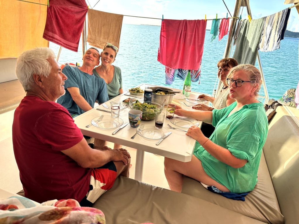Zum Sundowner gab es eine Flasche Prosecco. Helene und Walde erklärten sich bereit, das Abendessen, Nudeln mit Broccoli, zu machen und Melanie machte einen gemischten Salat dazu.