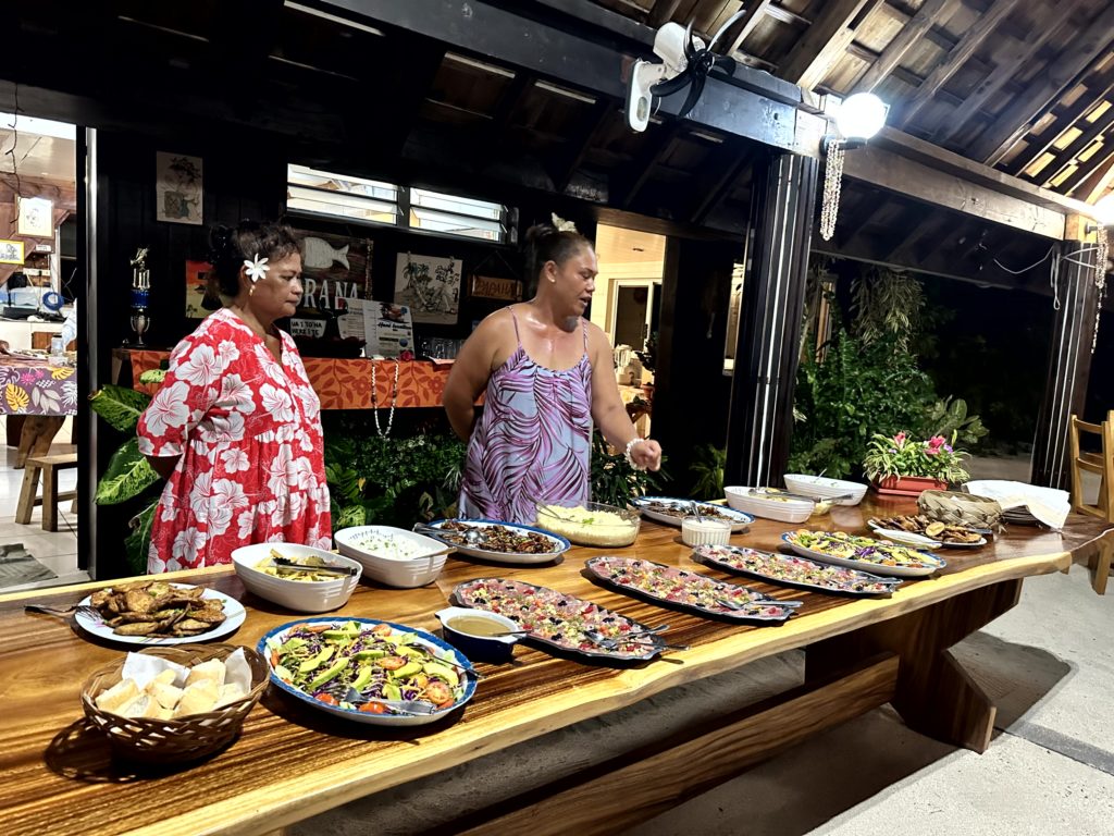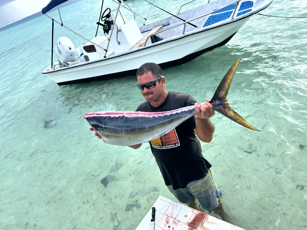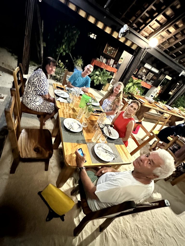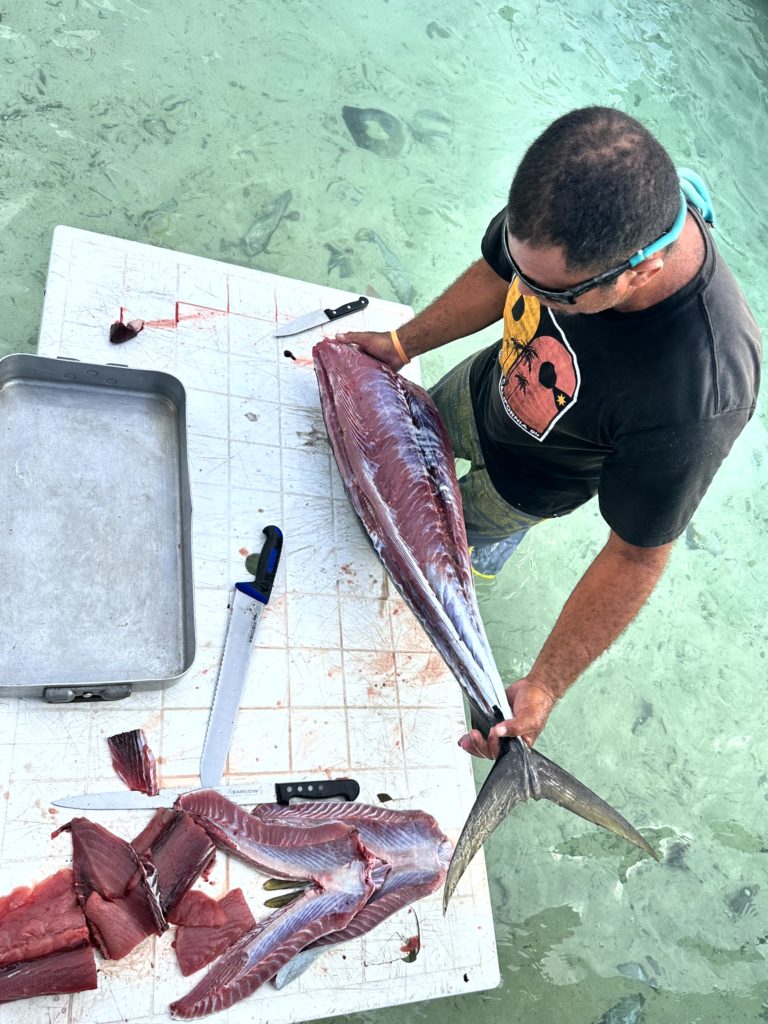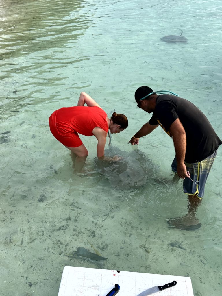 Mehr geht doch gar nicht. Um fünf wollten wir ins Papahanis rüber, wo wir für das Abendessen reserviert hatten. Die neue Crew war von der Location sehr begeistert. Als wir ankamen, wurde gerade der Thuna für das Dinner im/am Wasser zerlegt. Was für ein Spektakel. Die Abfälle lockten einige Rochen und kleine Haie an. Die Handys wurden für Fotos gezückt. Melanie und Helene durften sogar einen Rochen füttern.