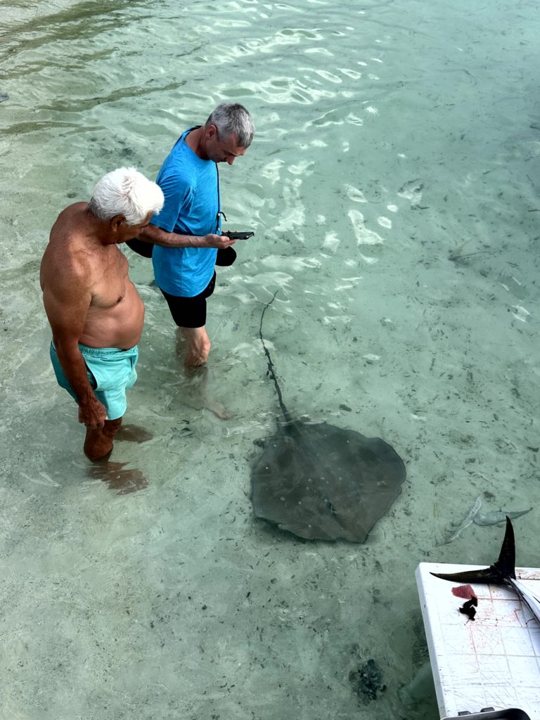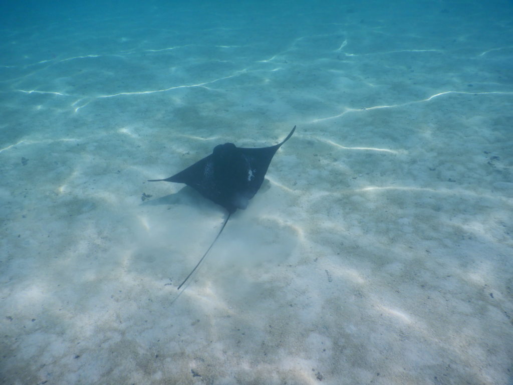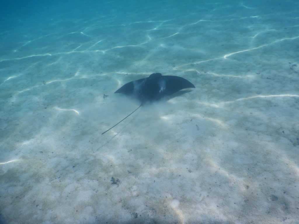 Nach dem Abwasch wurden erst Fotos gesichtet und getauscht, dann ging es ins Wasser. Heute waren besonders viele Rochen hier in der Lagune, manchmal auch zu zweit und zu dritt. Melanie machte mit ihrer Kamera tolle Aufnahmen. Für mittags hatte Walde einen leckeren Thunfischdip zubereitet. Gemeinsam ließen wir uns diesen mit Brot, Baguette und frischen Karotten schmecken. Danach hat Helene von den vielen reifen Bananen ein Bananenbrot mit Walnüssen für den Nachmittagskaffee gebacken. Ein herrlicher Bananenduft zog durch das Boot. Derweil sahen wir Adlerrochen im Wasser. Die sehen schon ein bisschen anders aus, als die normalen Stingrays und sind viel scheuer. Melanie versuchte ihnen zu folgen, aber die waren einfach zu schnell. Später versuchte ich mein Glück und tatsächlich konnte ich ganz nah an einen Eagle Ray ran, nur hatte ich keine Kamera dabei. Melanie filmte von außen. Als er mich bemerkte, ergriff er schnell die Flucht Richtung Boot. So konnte sie nochmal tolle Aufnahmen machen. Ich holte mir Martins Kamera und schnorchelte durchs Wasser. Fast zwei Stunden lang immer wieder Sichtung, bis mir dann doch noch einer vor die Linse kam.