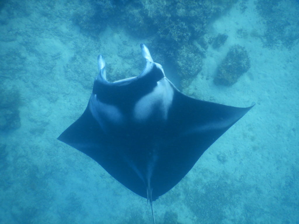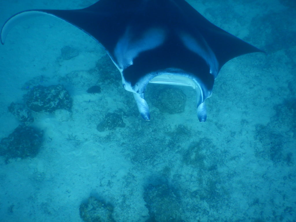 Man sagt ja Montagen immer nichts Gutes nach, aber heute hatten wir ein Highlight nach dem anderen. Kurz nach sieben setzte ich mich auf ein SUP und wollte Mantas ausspähen. Ich wusste noch ungefähr die Stelle vom letzten Mal. Die Sicht nach unten war sehr gut, ich konnte bis auf den Grund sehen. Ca 15 Min musste ich langsam hin und her paddeln und dachte schon, dass wir kein Glück hatten bis unter mir ein großer schwarzer Schatten schwebte. Mit Martin hatte ich ausgemacht, dass ich mit dem Paddel wedeln sollte, wenn Mantas da sind. Blöd nur, dass jetzt genau ein Segelboot zwischen uns lag. Ich wedelte und hoffte, Martin sieht mich trotzdem. Ich paddelte zur Boje, um das SUP festzubinden und schnorchelte zu der Stelle zurück. Es waren mindestens 3 Stück, die da fast schwerelos durch das Wasser glitten. Die Foto und Videoaufnahmen waren jedenfalls sensationell.
