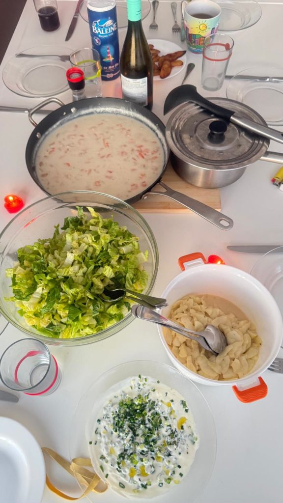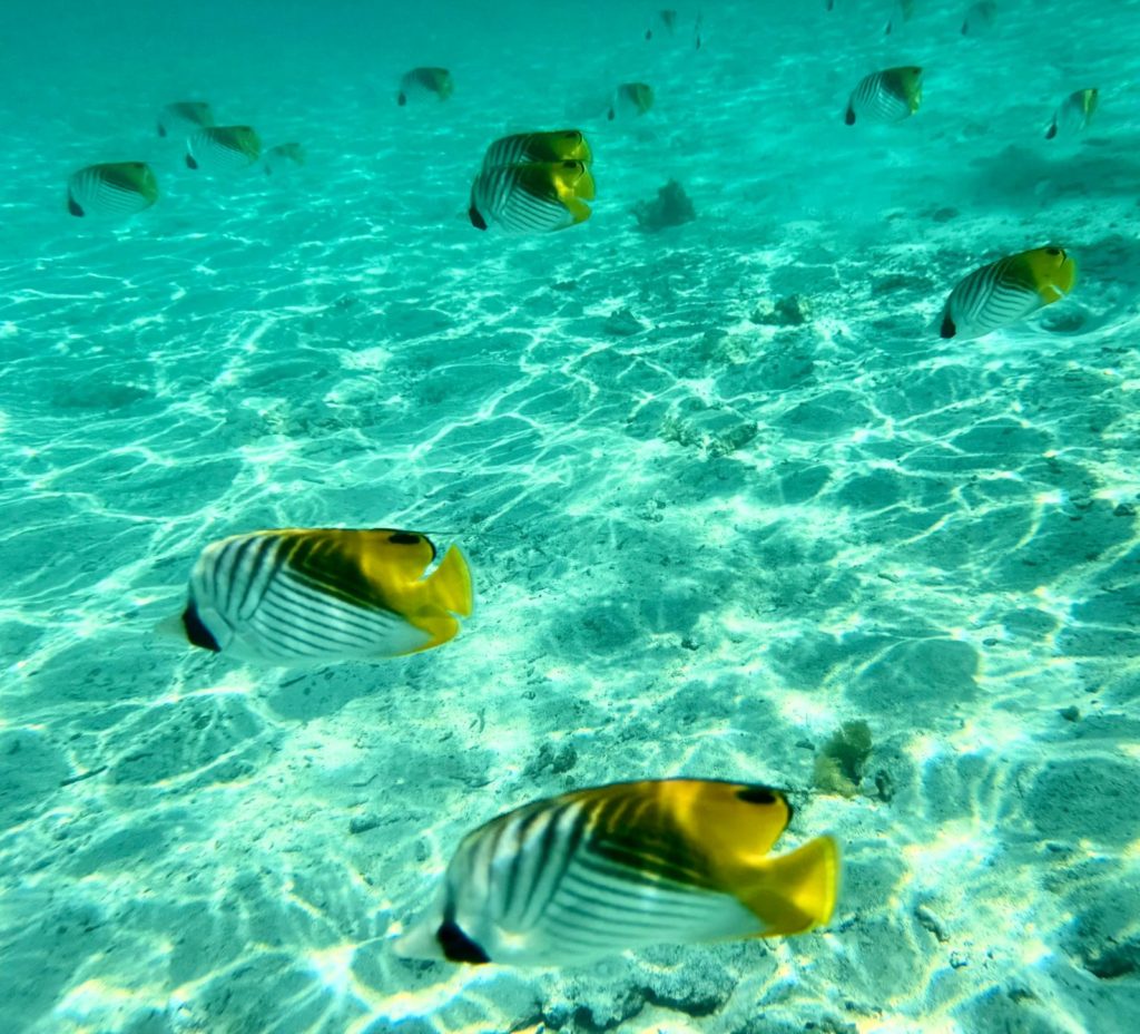 Sonst war heute nur schnorcheln und chillen angesagt. Melanie wollte einen Strandausflug machen, deswegen hat Martin sie nachmittags ans Ufer gefahren. Zum Kaffee hatten wir noch Helenes Rotwein/Weißweinkuchen mit Sahne. Den Rest des Nachmittags genossen wir einfach die tollen Farben des Wassers und den Blick auf den Mount Otemanu. Walde und Helene bereiteten das Abendessen vor. Reis mit Shrimps in Kokossosse und leckeren Salat.