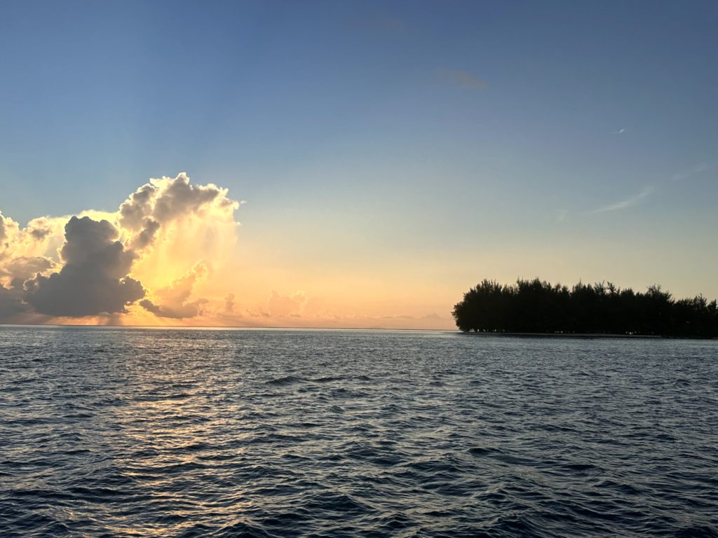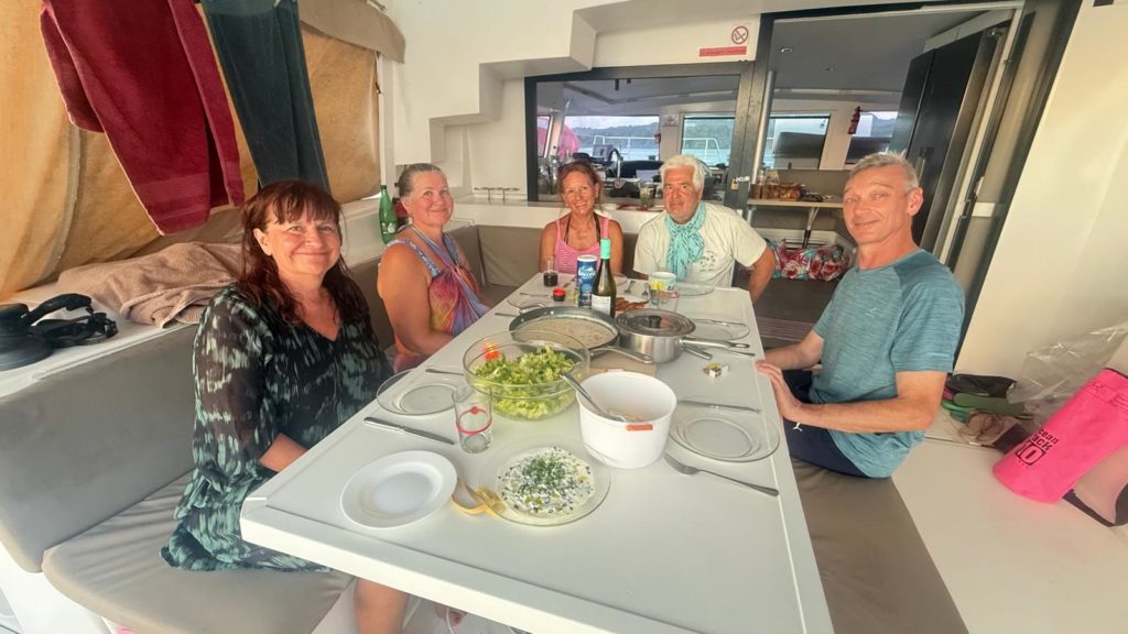 Martin holte Melanie wieder pünktlich zum Abendessen mit dem Dinghi ab. Nachdem Abwasch haben wir im Bordkino den zweiten Teil von Vaiana geschaut. Passte wunderbar in die tolle Kulisse.