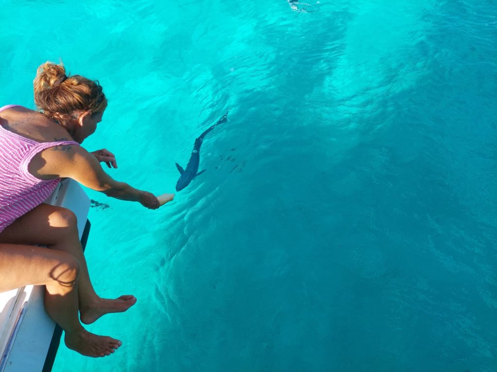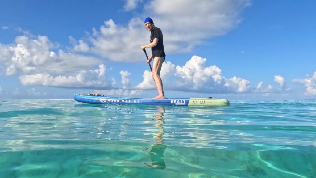 Danach motorten wir weiter mangels Wind zu unserem nächsten Ankerplatz. In das klare herrliche Wasser musste man einfach gleich reinspringen. Ca 1,5 km entfernt lag das Motu Oatara, bei Google als Vogelinsel beschrieben. Martin ließ sich wieder von mir mit dem SUP auf die Insel chauffieren. Die war leider privat und das Betreten verboten. Einen Blick haben wir doch riskiert. Vögel haben wir keine gesehen. Die Crew schnorchelte derweil zu einem schönen Spot mit einigen Korallen und bunten Fischen.