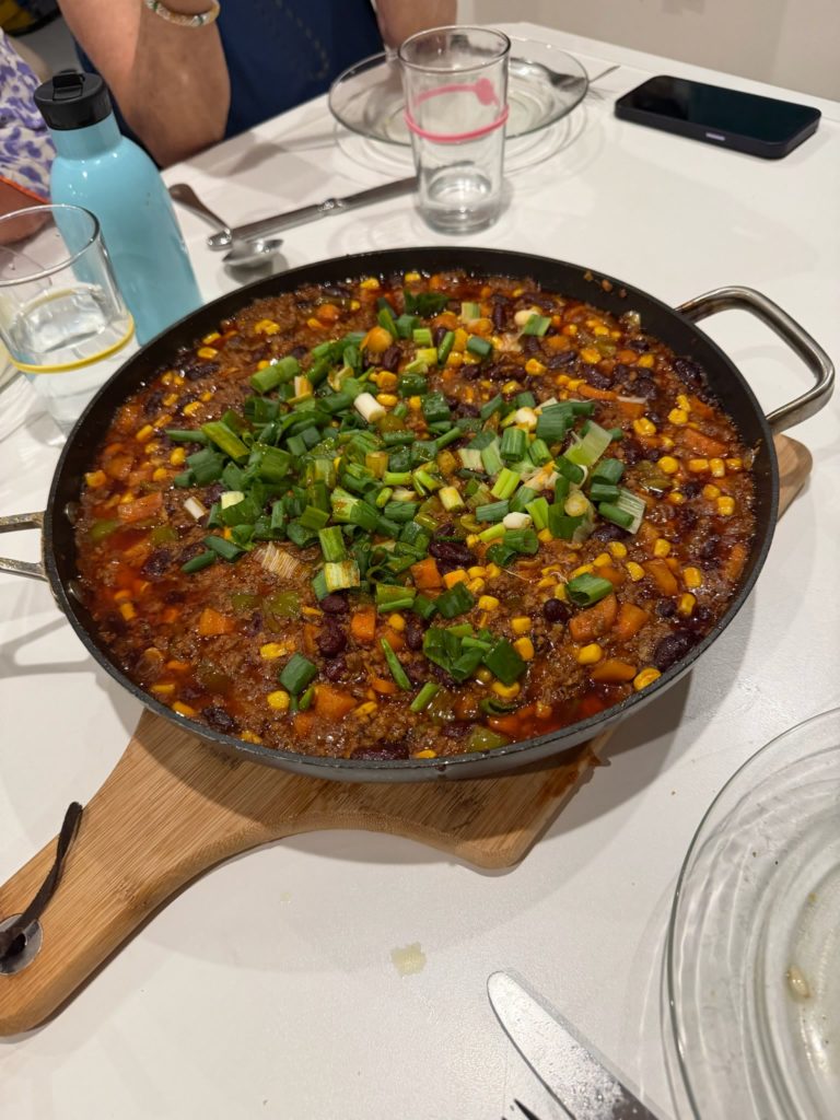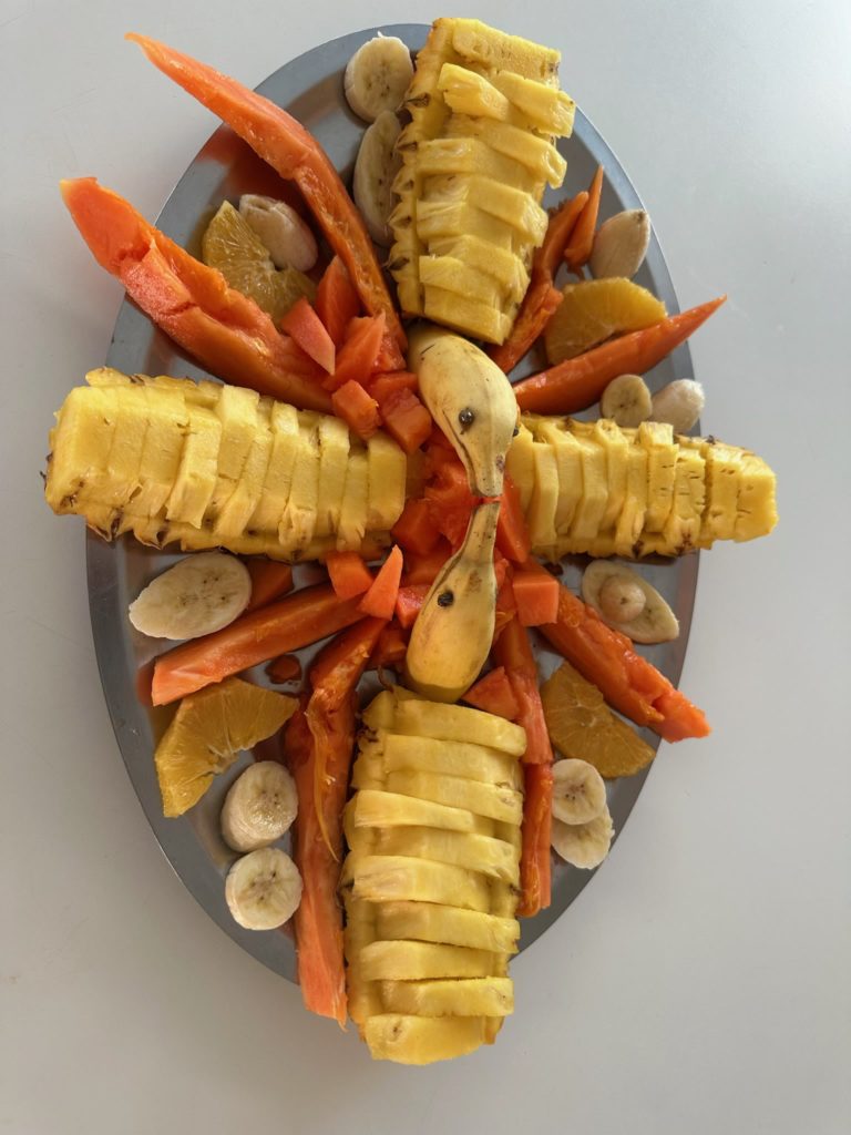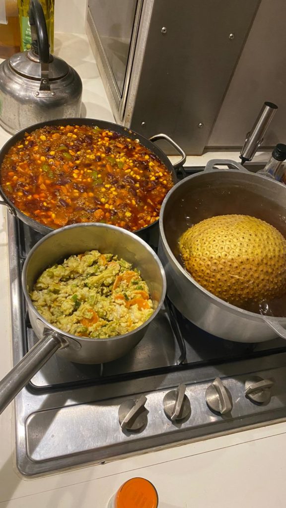Zurück auf dem Boot wurde ein bisschen geratscht und gechillt. Isabel kochte heute ein leckeres Chilly , Martin bereitete die mitgebrachte Brotfrucht und ich machte für die Vorspeise einen bunten Salat.