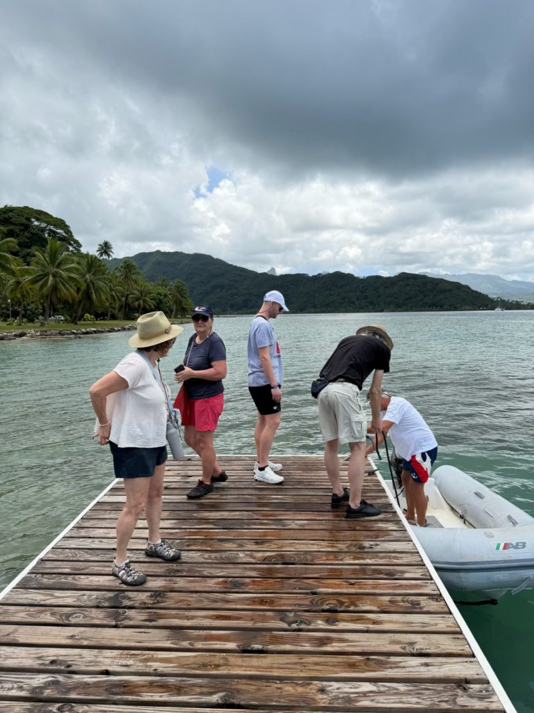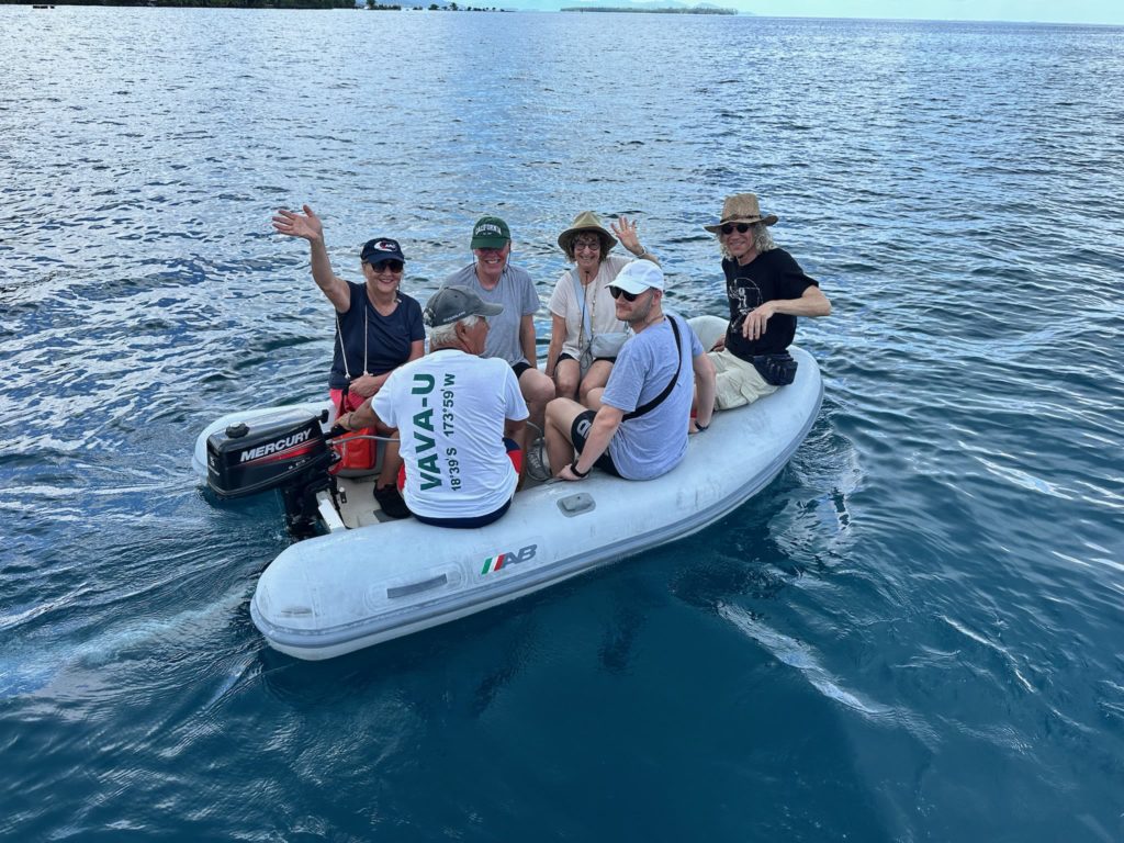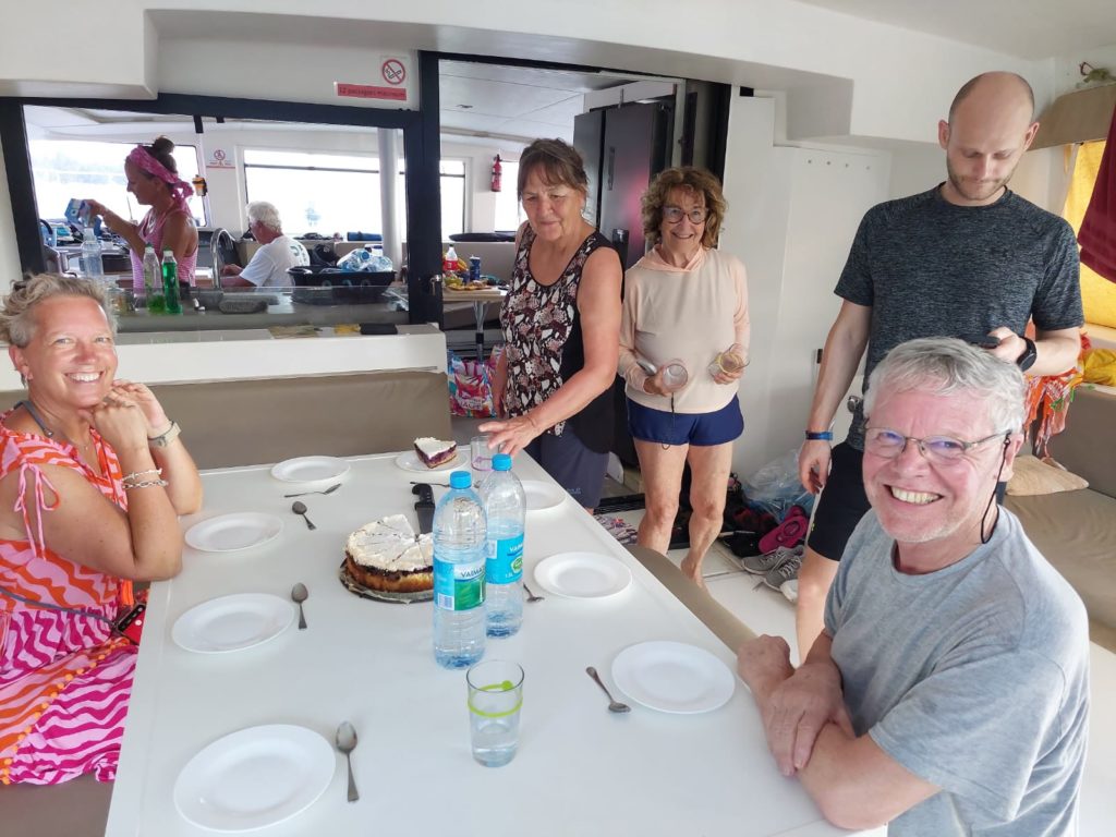 Nach zweieinhalb Stunden ließ unser rocking Ankerman Hartmut den Anker runter- Das Dinghi wurde abgelassen und die ganze Crew, bis auf Christine und mich, setzte über an Land. Christine wollte lieber eine Runde schwimmen, da sie schon eine Besichtigung vom Marae hatte. Ich machte derweil Kaffee. Kuchen war schon fertig, wie immer, ein Mitternachtsprodukt.