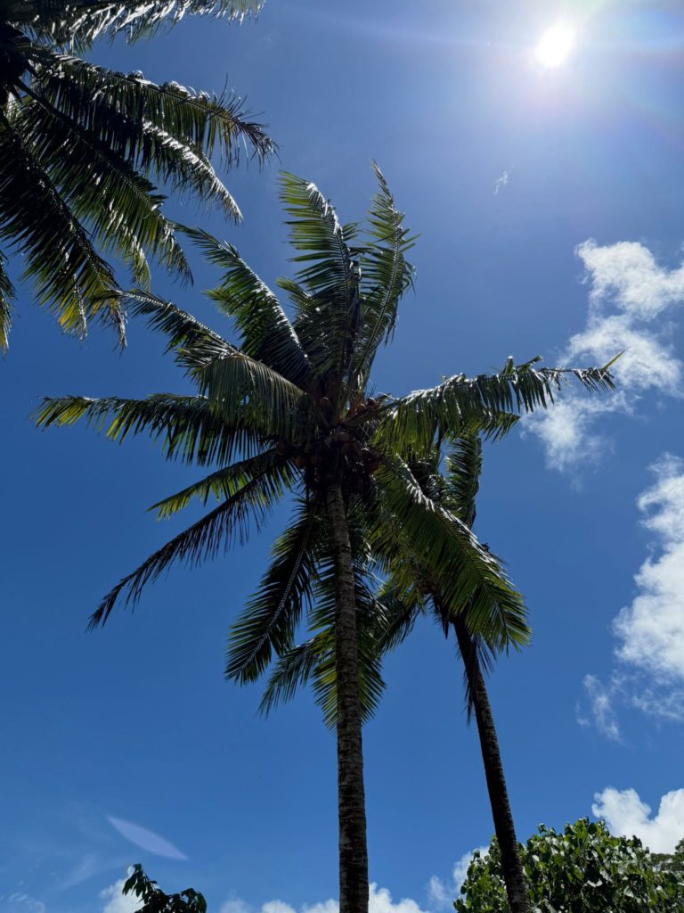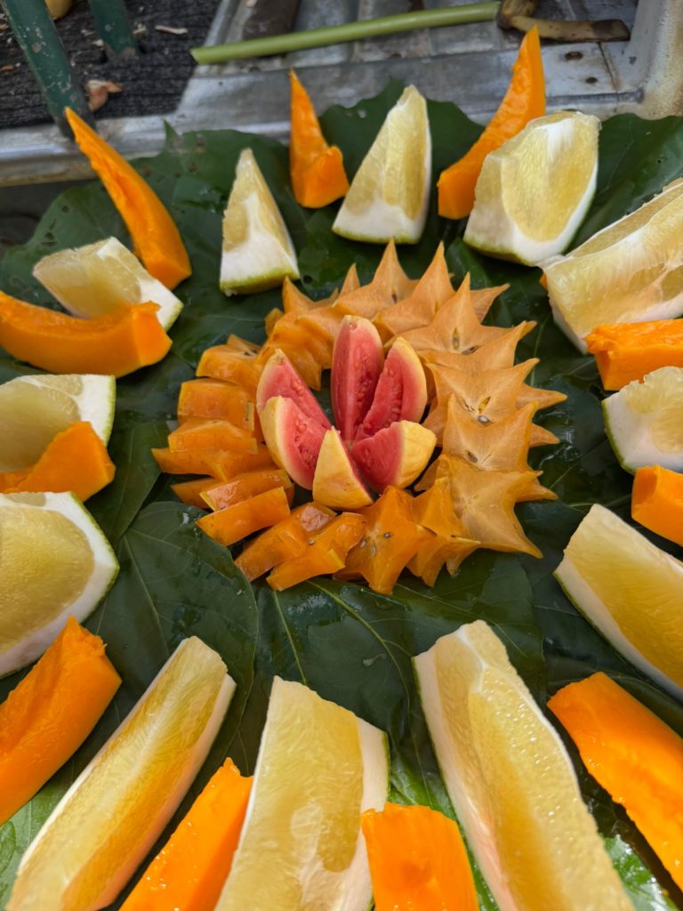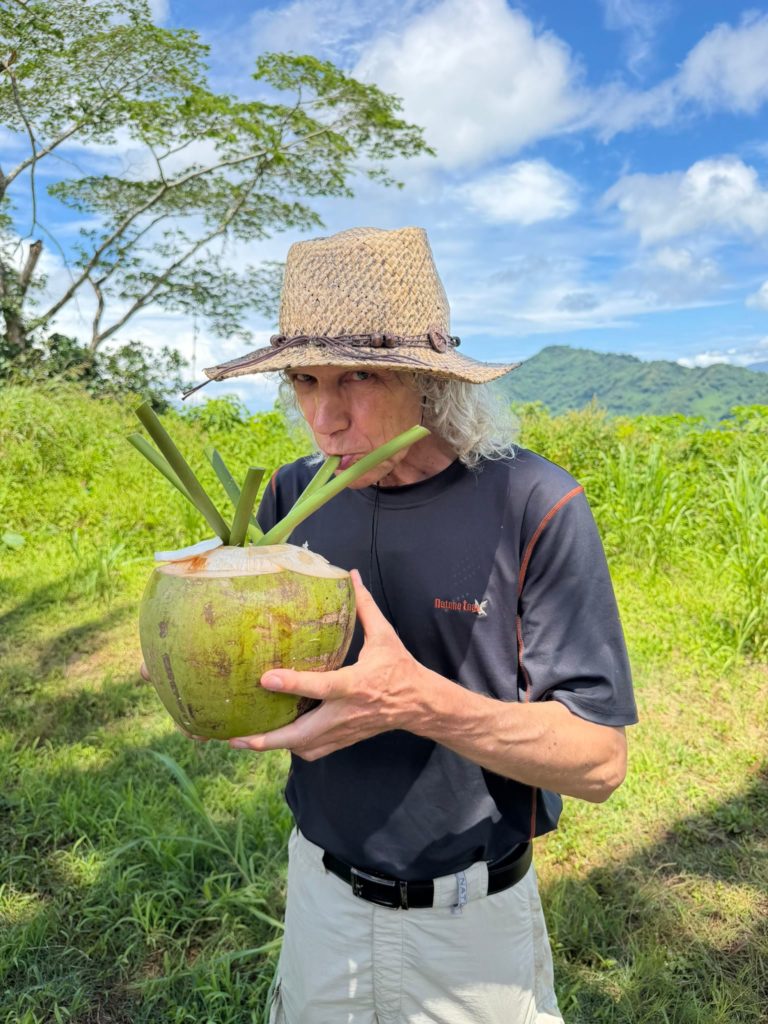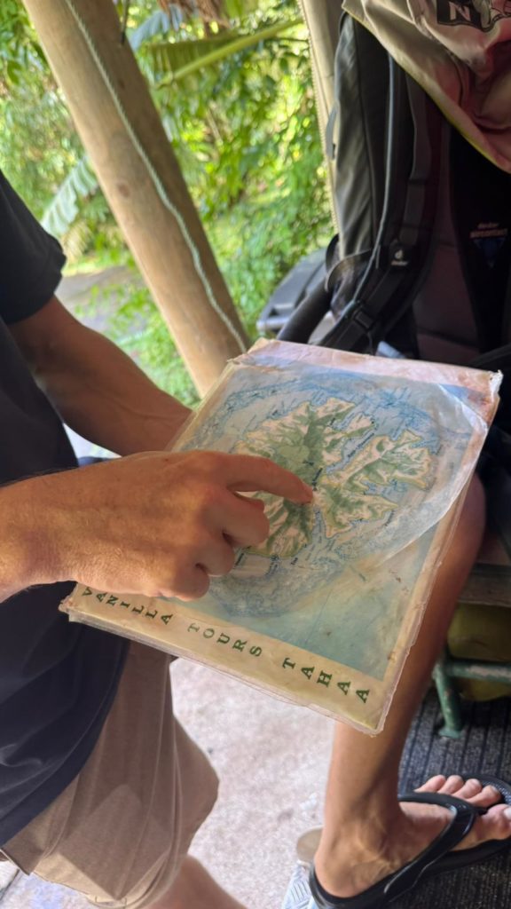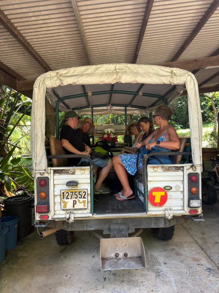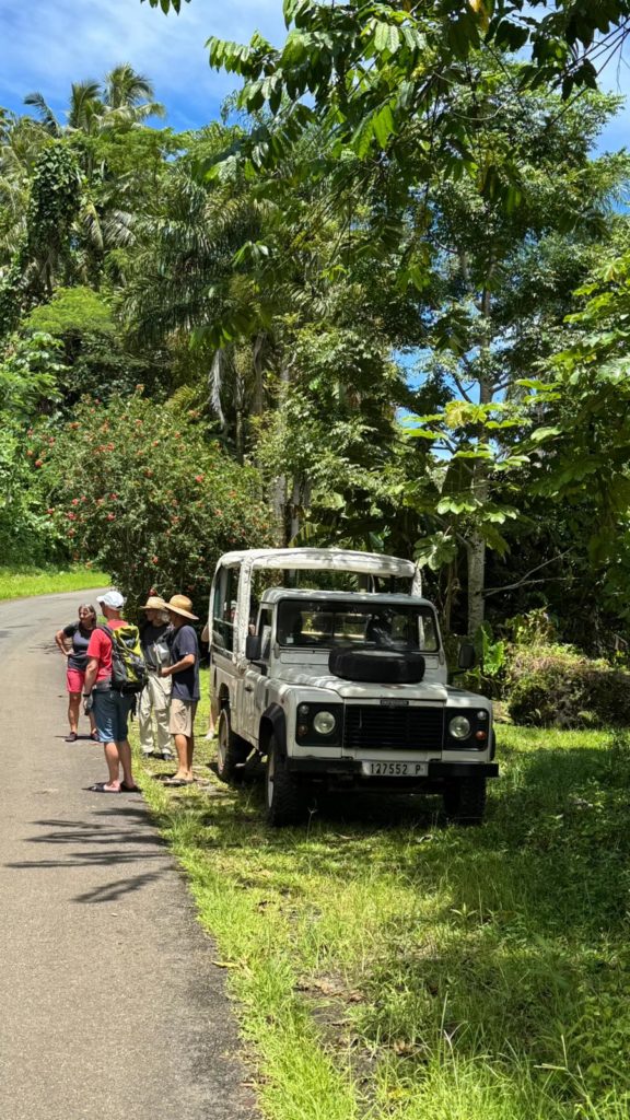 Anschliessend geht es abenteuerlich weiter. Noah lässt Luft aus den Reifen – jetzt kommt der Jeep richtig zum Einsatz. Über schmale, matschige Trails arbeitet sich das Fahrzeug durch den dichten Dschungel nach oben. Vom Bergkamm eröffnet sich eine spektakuläre Aussicht über beide Seiten der Insel, über das satte Grün der Landschaft und die Lagune. In der Ferne zieht bereits eine dunkle Gewitterfront auf. Noah nutzt die Gelegenheit für einen kurzen Snack. Auf einer improvisierten Platte aus wilden Hibiskusblättern liegt frisch geschnittenes Obst aus seinem Garten. Dazu werden die Kokosnüsse geöffnet – getrunken wird natürlich mit den Papayastrohhalmen. Währenddessen grollt der Donner immer näher, bis die Wolken die Aussicht komplett verschlucken und der tropische Regen über den Bergen losbricht. Die Rückfahrt durch den nassen Dschungel hat fast etwas Magisches. Alles wirkt noch grüner, Wasser tropft von den Blättern, und der Wald duftet nach frischer Erde.