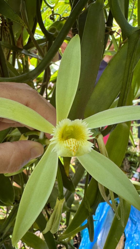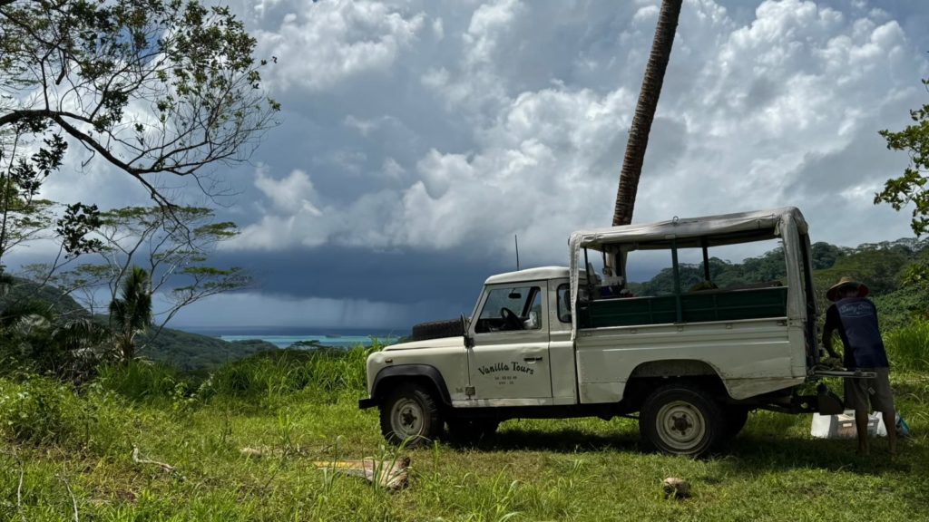 Danach wartet bereits der 4×4-Jeep. Im Wagen steht ein Gefäß mit Zitronenwasser, ausserdem hat Noah Trinkkokosnüsse und Obst aus seinem Garten dabei. Mit ein paar schnellen Schnitten seiner Machete zeigt er eine kleine Alltagstechnik: aus den Stielen von Papayablättern lassen sich erstaunlich gute, komplett natürliche Trinkhalme herstellen. Der erste Stopp führt zu einer kleinen Vanilleplantage. Noah erklärt, warum Vanille in Polynesien aufgrund der aufwändigen Produktion so teuer ist. In ihrer ursprünglichen Heimat Südamerika übernimmt eine spezielle Biene die Bestäubung der Blüten. Auf Taha’a fehlt dieses Insekt – deshalb wird jede einzelne Blüte von Hand bestäubt. Dies wird Vanilla Wedding genannt. Aus jeder Blüte wächst später genau eine Schote. Nach etwa sieben Monaten erfolgt die Ernte, gefolgt von einem monatelangen Prozess aus Trocknen, Fermentieren und wiederholtem Massieren der Schoten, bis die aromatische schwarze Vanille entsteht, für die die Insel bekannt ist.