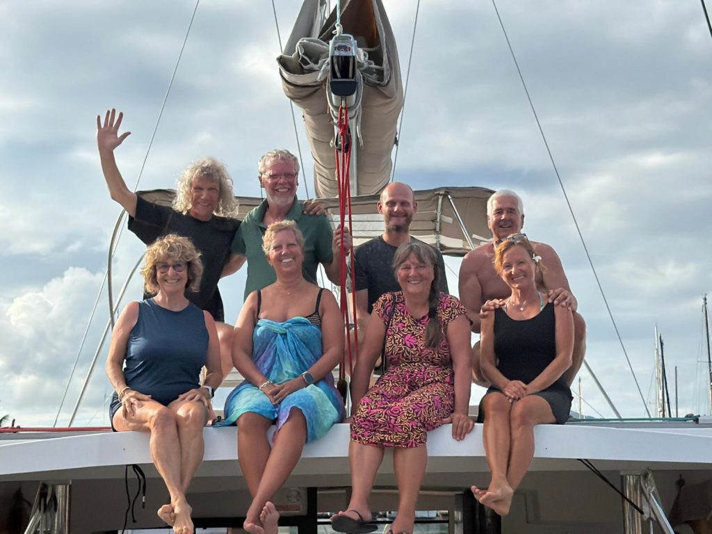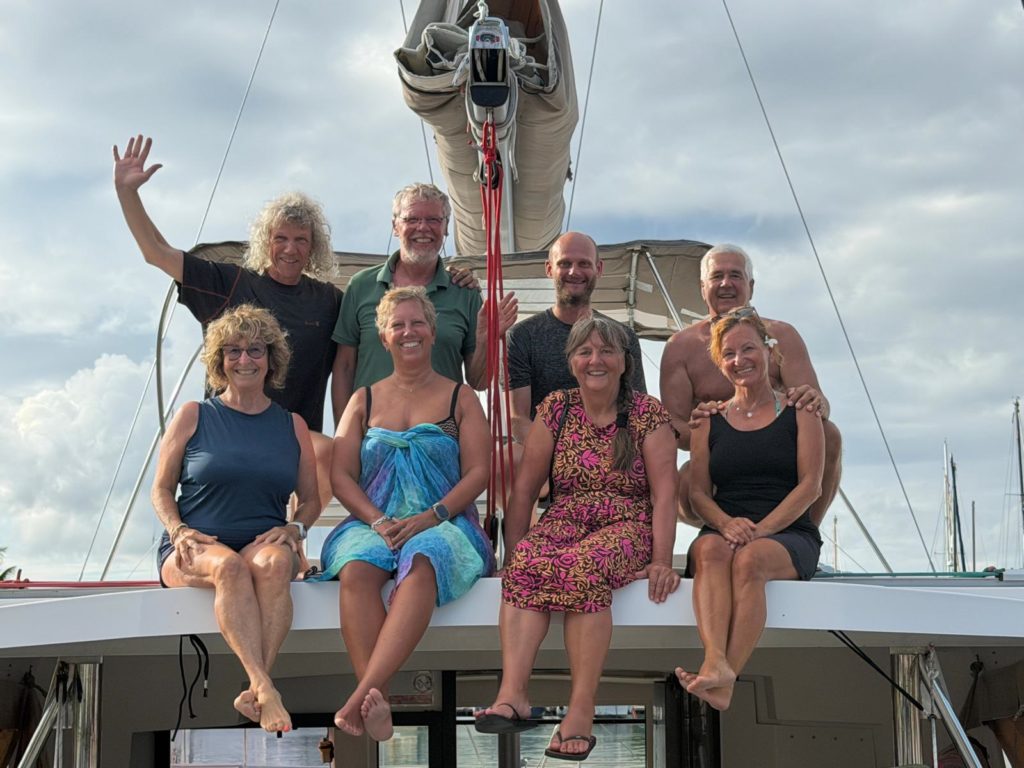 Bei strahlendem Sonnenschein ankerten wir nochmal um zu einem wunderschönen letzten Badestopp. Dort im türkisen Wasser ließ es sich die Crew nicht nehmen, ein letztes Mal ausgiebig das Wasser und die Sonne zu genießen. Um halb zwei gab es dann den letzten Kaffee und Martins leckeren Pfirsichkuchen an Bord, dann hieß es Anker auf Richtung Uturoa . Pünktlich um halb vier holten uns die Jungs von der Marina ab zur Tankstelle. Die hatte leider schon zu, also doch zurück in die Marina. Ups, jetzt stand schon der erste Koffer im Cockpit. Isabels Flug ging heute Abend zurück nach Papeete, weil sie morgen ganz früh von dort nach Hause fliegt. Wir machten noch ein lustiges Abschiedsfoto , bevor das Taxi kam.