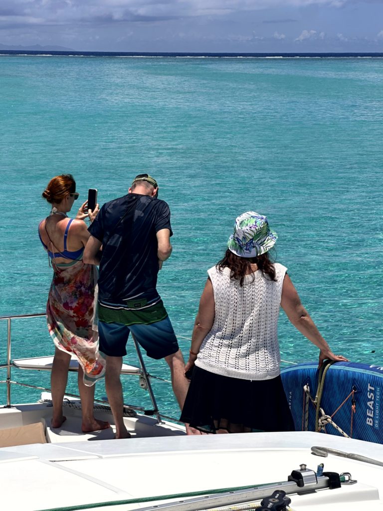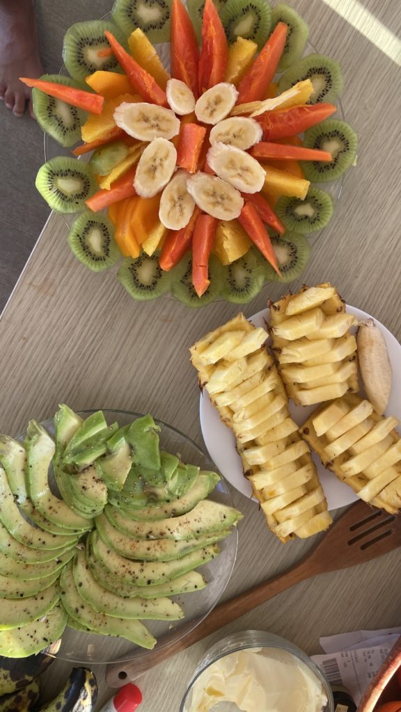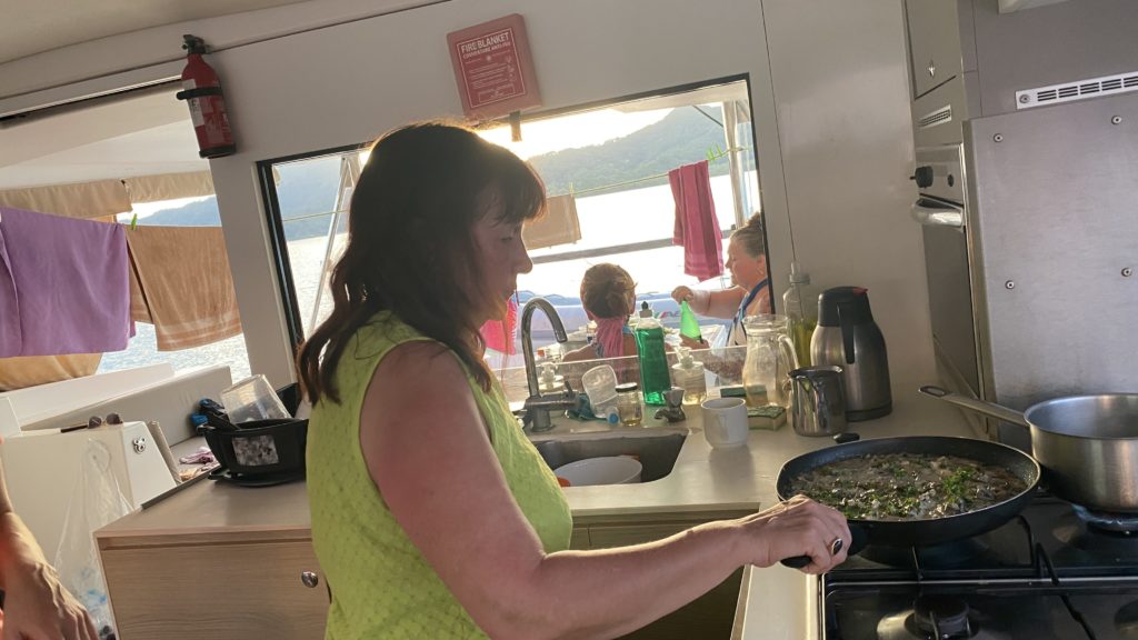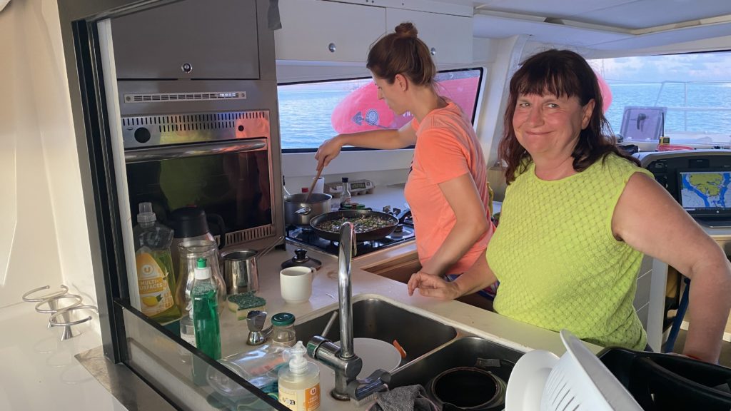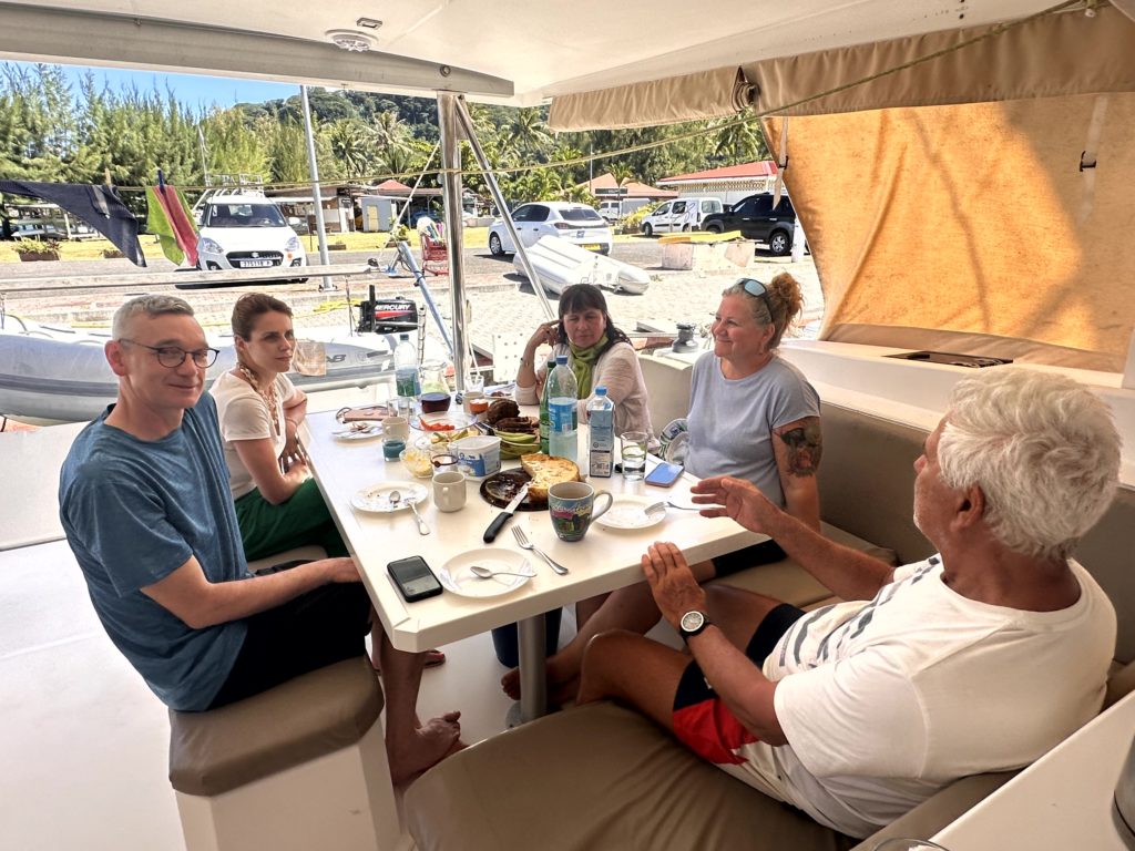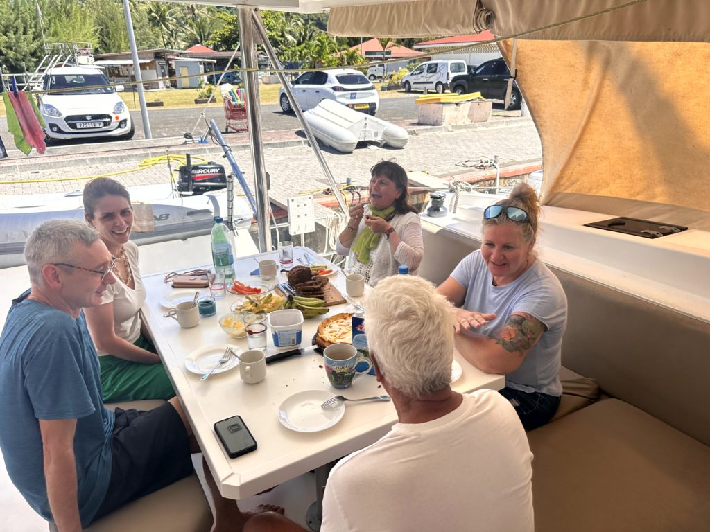 Um elf kam dann schon ein fröhliches Hallo an Deck. Melanie war die erste, die wir leider noch ein bisschen vertrösten mussten. Danach kam Walde und um 14.00 Uhr wie ausgemacht Helene und Sylvia. Bis dahin waren wir auch fertig. Ich holte noch ein paar Früchte, ein Baguette und eine Avocado aus der Stadt für den ersten Hunger. Dann gab’s Kaffee und Kuchen und Snacks zur Begrüßung. Jeder erzählte ein bisschen von sich. Anschließend ging Martin die Einkaufsliste durch und wir schwärmten alle aus zum Großeinkauf.